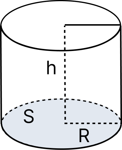 где S — площадь основания цилиндра. R — радиус основания, h — высота цилиндра