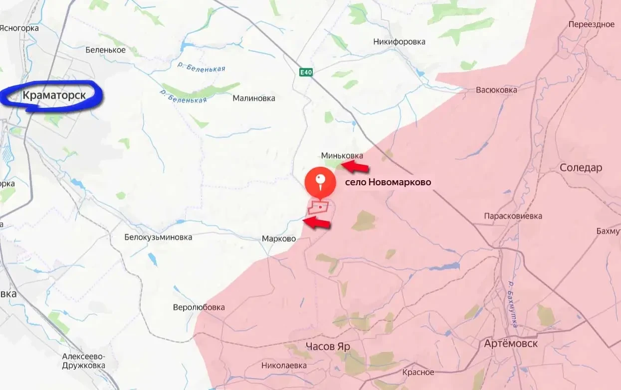 От передовых позиций ВС РФ в районе освобождённого Новомарково до юго-восточной окраины Краматорска – около 16 км.