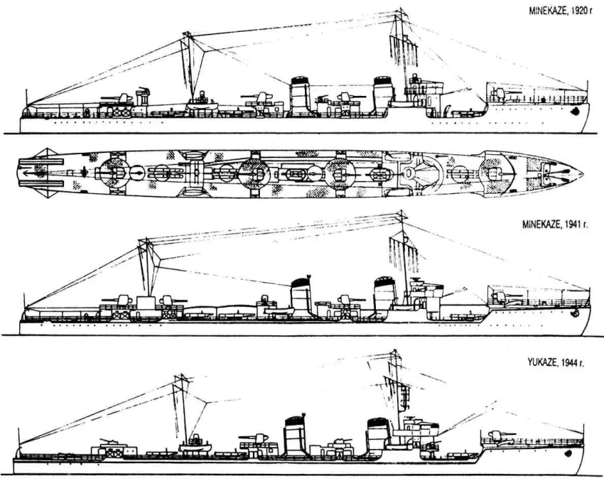 Как говорили сами японцы, путь в тысячу ри начинается с первого шага. Первый шаг был сделан в 1920 году, когда на воду были спущены первые «Минекадзе», которые через 20 лет напрочь устарели, но в те годы вообще технический прогресс несся семимильными шагами, так что все закономерно. Но уроки «Минекадзе» пошли впрок, и дальше корабли были уже на приличном мировом уровне.