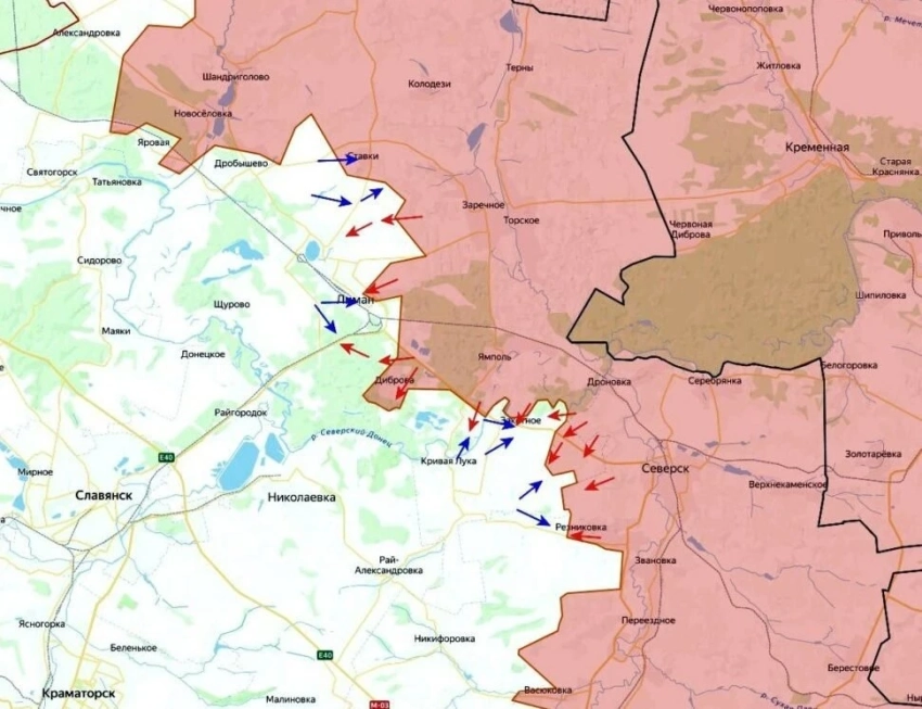 На Краснолиманском направлении ВС РФ глубже вклиниваются в оборону противника на севере Красного Лимана, а на юге от города ведут бои в лесах, на территории АЗС. Выше по фронту наши продвинулись вдоль Северского Донца, увеличив зону контроля на 3 км, и зашли на северо-восточную окраину Святогорска. Перерезав дорогу Карповка-Коровий Яр, наши обходят село с востока, а также пытаются выйти к дороге на Александровку, чтобы обойти Коровий Яр и с запада. Также наши расширили контроль в Редкодубе, в лесах в районе Ольговки.