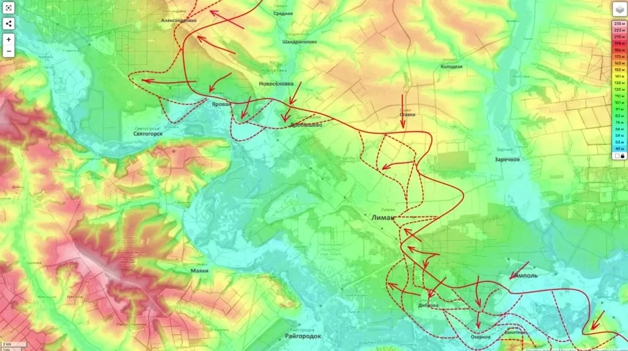 Вместе с этим напряжённая ситуация наблюдается в районе Красного Лимана. Российские войска подошли к городу с севера, завязав бои непосредственно в городской черте.