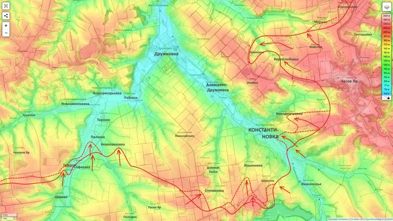 Подобная конфигурация фронта означает ликвидацию очагов сопротивления на флангах Константиновки и создание угрозы полного окружения города. Украинские источники подтверждают, что логистика гарнизона критически нарушена, оборона дезорганизована. Под угрозой перерезания находится трасса Артёмовск - Красноармейск, что станет фатальным для снабжения группировки ВСУ.