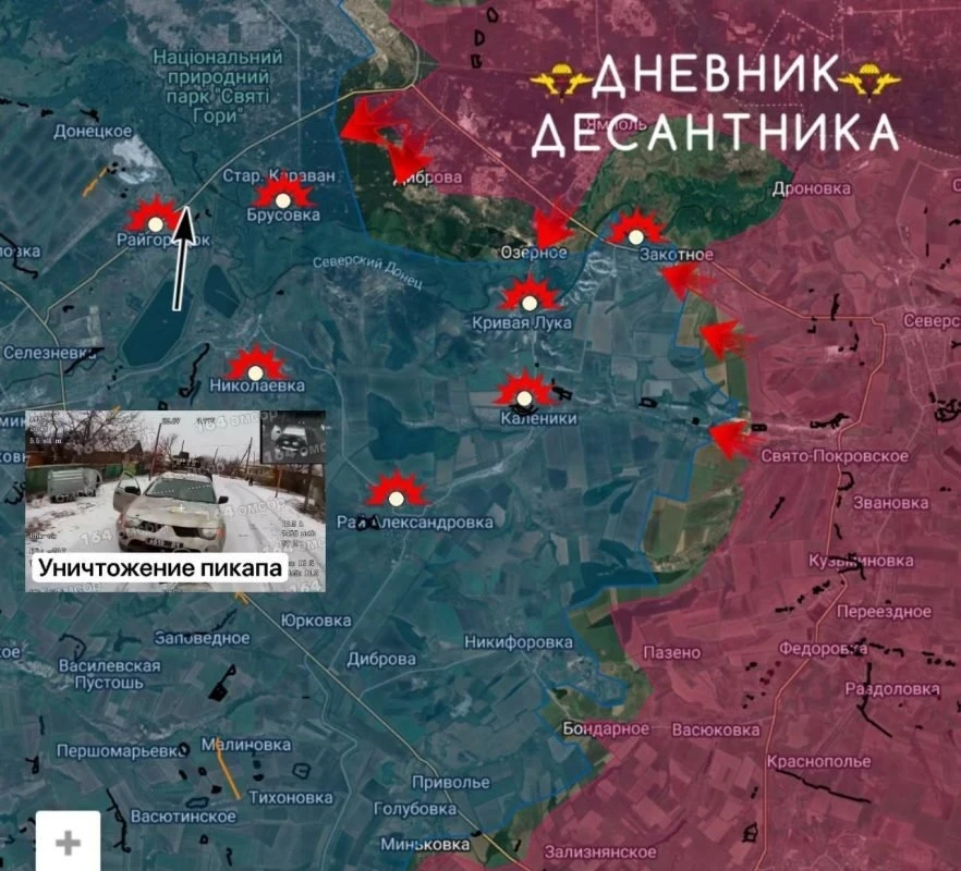 Продолжаются удары по прифронтовым населенным пунктам украинских войск, включая Кривой Лук, Каленики, Рай Александровку и Резниковку. Обрабатываются ключевые пути снабжения в направлении Закотного и мелового склона, а также позиции противника в Славянской ТЭС, Николаевке, Брусовке, Старом Караване, Пискуновке, Щурово и Райгородке. В ходе боевых действий полностью взят под контроль лесной массив западнее Дибровой, а продвижение продолжается в центральной части Ильичевки (Озерное).