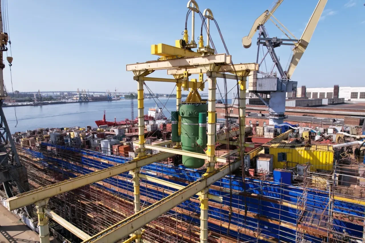 Установка ядерного реактора в корпус будущего судна «Якутия», август 2022 г.