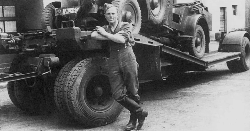 На фотографиях запечатлён эпизод работы немецкого эвакуатора. Легковой автомобиль офицера Люфтваффе вышел из строя и теперь эвакуируется с помощью одного из тяжёлых низкорамных прицепов вермахта – Sd.Ah. 115 в 10-тонном варианте. Sd.Ah. 115 (Sonderanhänger 115 – специальный прицеп 115) – это тяжёлый низкорамный трал, разработанный фирмой Goldhofer и производившийся с 1937 года. 10-тонная версия предназначалась для перевозки лёгкой и средней бронетехники, повреждённых автомобилей и тяжёлых грузов. Прицеп имел низкую погрузочную платформу, аппарели для заезда и мог буксироваться мощными полугусеничными тягачами (например, Sd.Kfz. 7 или Sd.Kfz. 9)