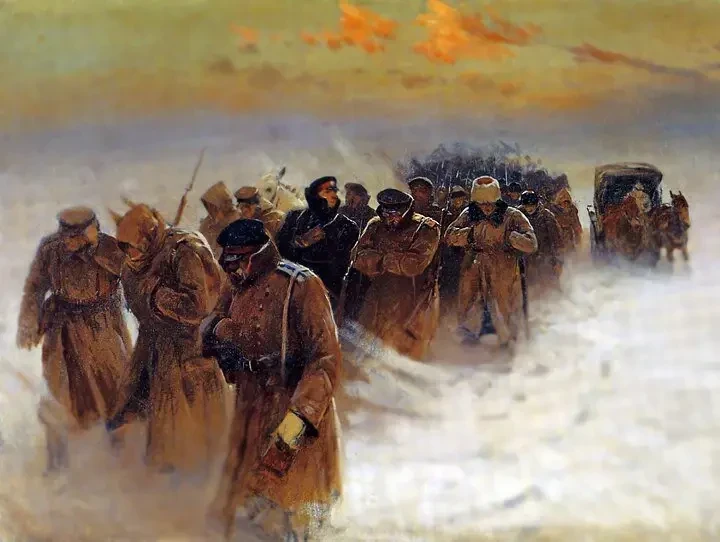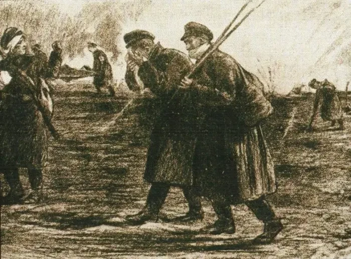На этом рисунке неизвестного белогвардейца мы видим отступающих от Екатеринодара «добровольцев»