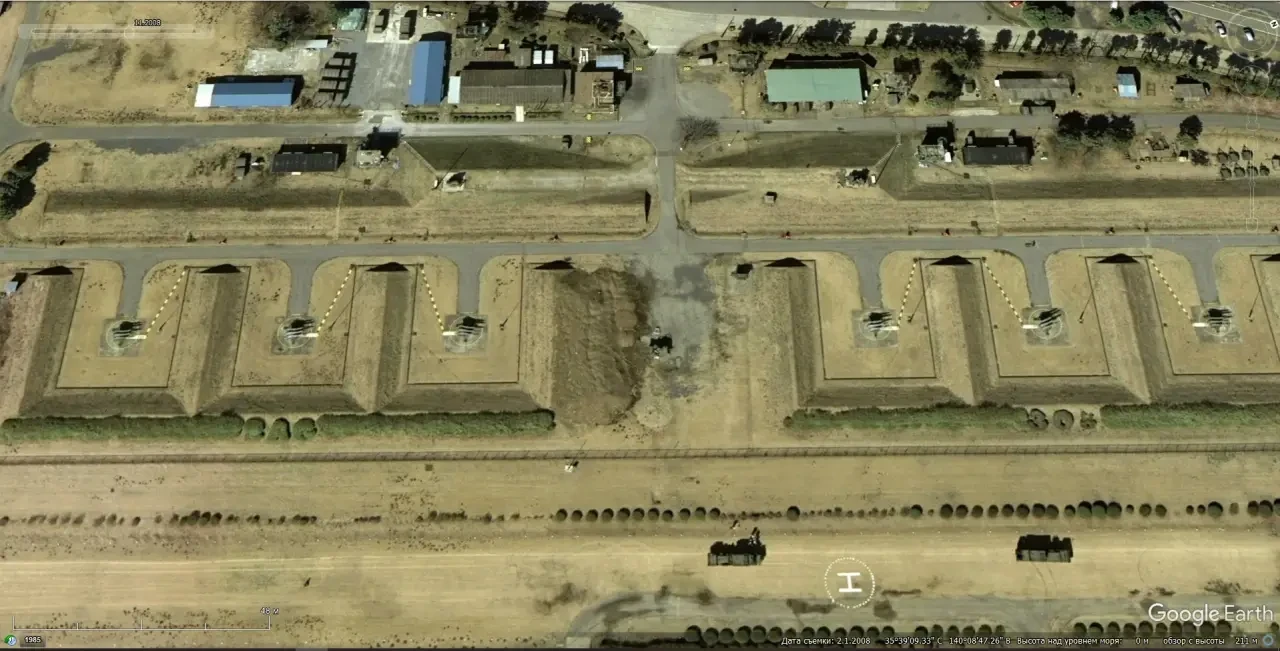 Спутниковый снимок Google Earth: позиция ЗРК Hawk Type III на военной базе Симошизу в Токио. Снимок сделан в феврале 2008 года