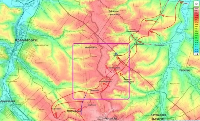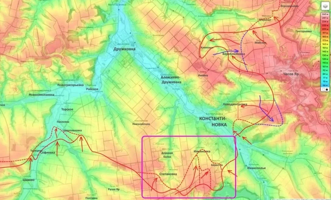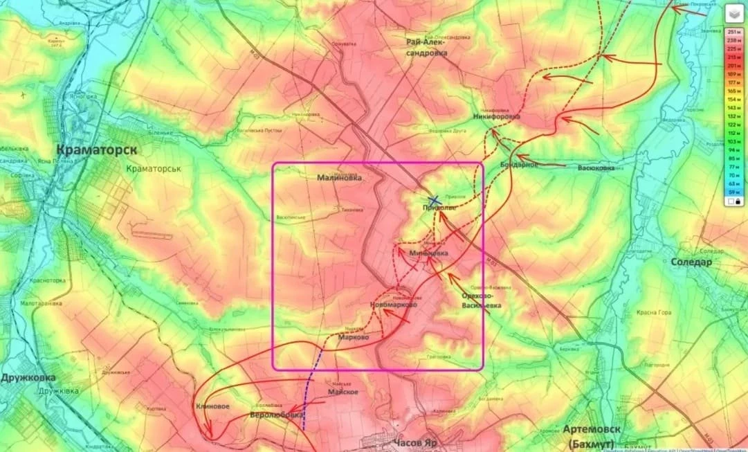 Согласно сведениям блогера, в настоящее время российские военные продвигаются в направлении Малиновки по водораздельному хребту, проходящему восточнее Славянска и Краматорска.