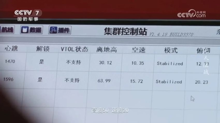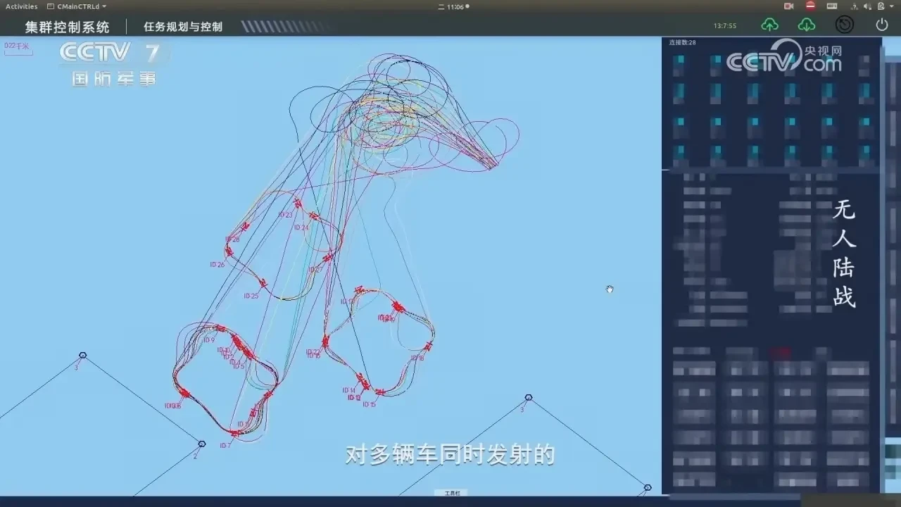 CCTV7 показало, как оператор выдаёт беспилотной системе задачи для выполнения. Также показали процесс отслеживания действий «роя». На условной карте района отображалось большое количество меток беспилотников, их маршруты и прочая информация.