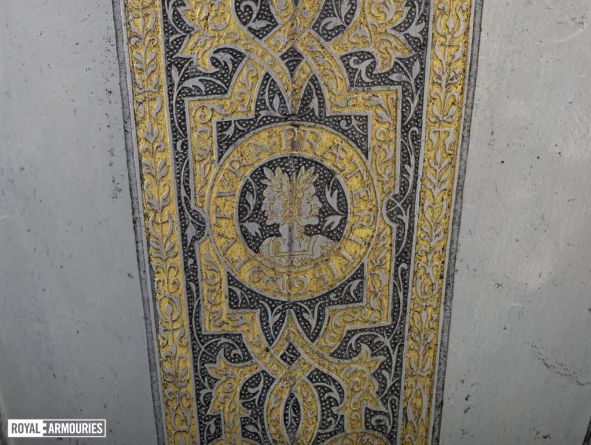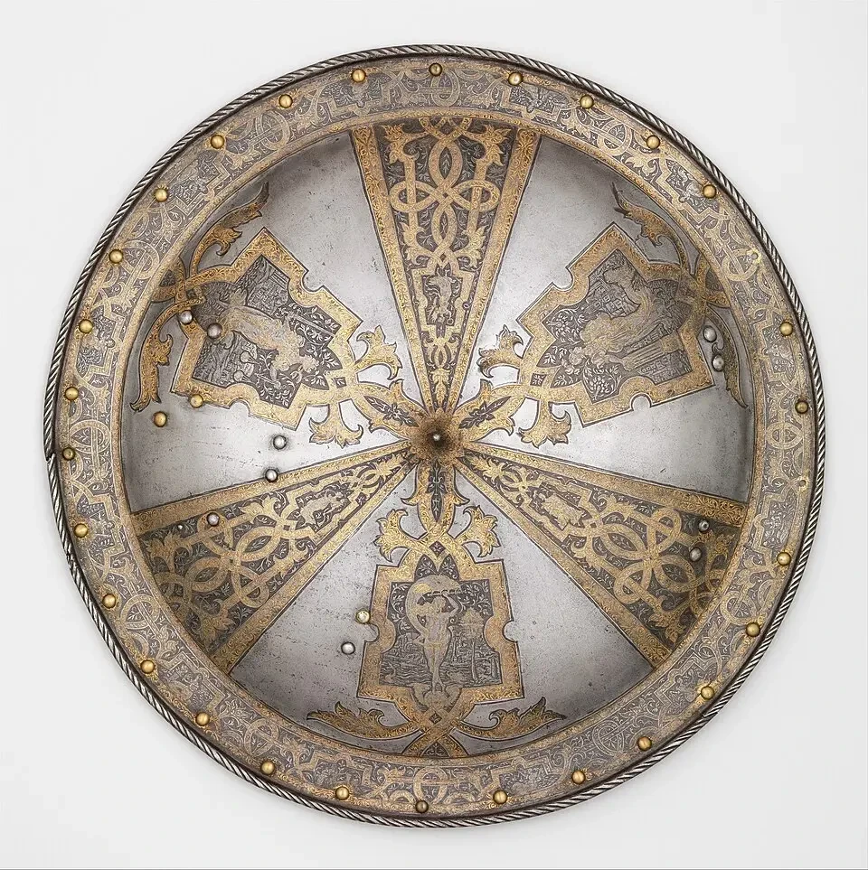 Изысканный позолоченный щит, изготовленный для сэра Джона Смайта, ок. 1575–1585. На этом искусно украшенном щите внутри изображены позолоченные олицетворения добродетелей: удачи, справедливости и стойкости. В настоящее время хранится в Метрополитен-музее