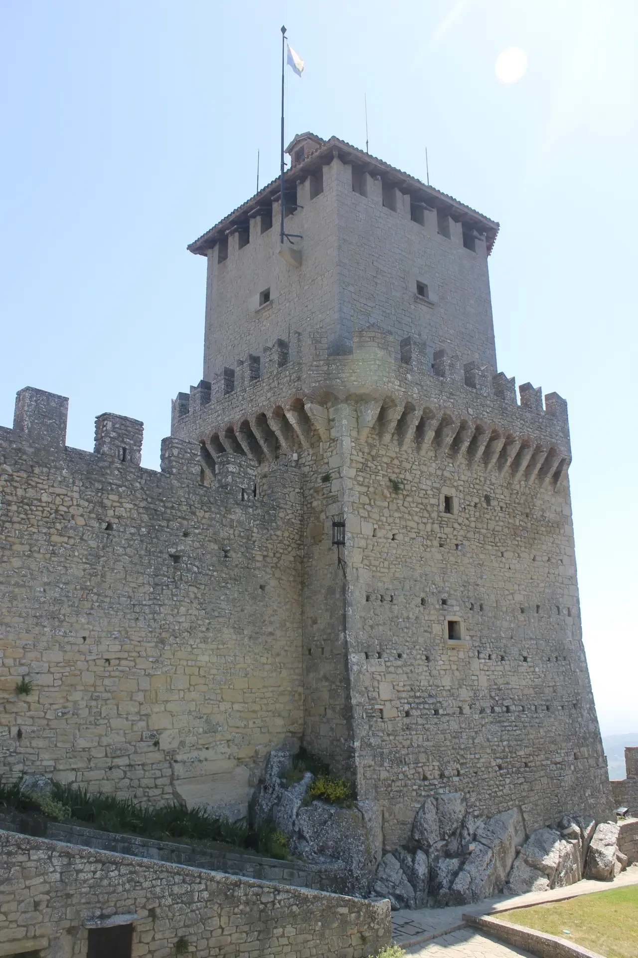 Башня Гуаита одного из замков Сан-Марино имеет необычную клиновидную форму. Хорошо видны ряды машикулей