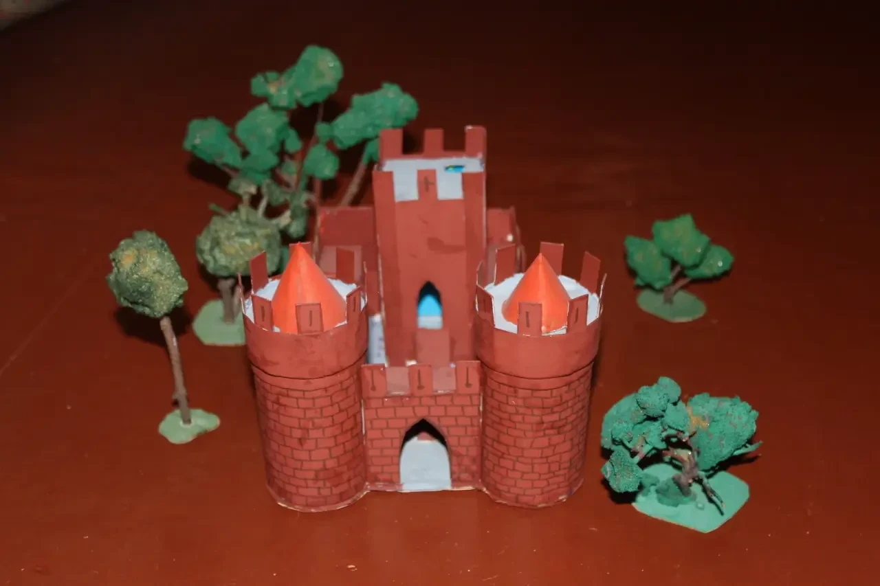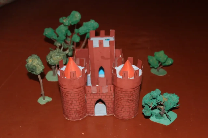 Сделать макет замка в школе мечтают многие ребята, настолько они им нравятся, вот только взрослые в этом деле не всегда им готовы помочь. А зря – создание такого макета вполне может стать и первым шагом к специальности архитектора, и, возможно, даже определить будущее. Причем материалы для этого можно использовать самые простые. Например, в макетах замков, в которых имеются круглые башни, их делают из картонных трубок из-под туалетной бумаги. «Башни» с более толстыми и реалистичными стенами можно сделать из трубок из-под пищевой алюминиевой фольги. Стены – из тонкого пенопласта, оклеенного картоном из магазина «Леонардо» – они сразу же дают масштабную толщину! Можно их также слепить и раскатать из самополимеризующейся глины, на которой, пока она не затвердела, можно оттиснуть рельефную кладку из «дикого камня» и даже прорезать окна и бойницы. Крыши круглых башен делают из плотной бумаги, склеенной на конус… То есть ничего сложного в этом нет.