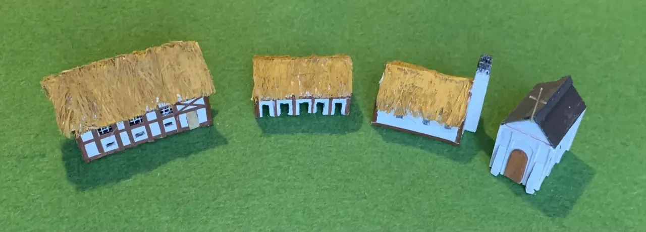 Макеты домиков: казарма, конюшня, кузница и церковь в романском стиле. «Соломенные крыши» из… набора льняной пряжи для герметизации труб