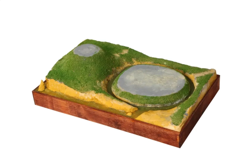 Основание после раскраски и обсыпки «травой», которую нужно сыпать на клей ПВА. Ров наполнен «водой» из эпоксидной смолы