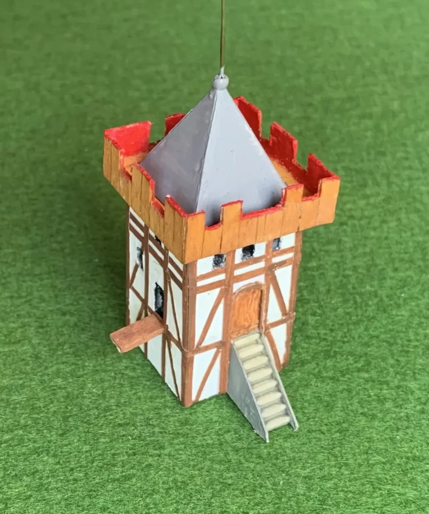 Однако ничуть не менее интересно сделать макет замка «мотт и бейли», тем более что у нас их вряд ли вообще кто-нибудь делал. Материалы – картон из-под кассет для яиц. Пенопласт для основания. Деревянные линейки – для обрамления подиума, ну и рейки толщиной 1-2 мм для изготовления ограды и заборов. Сами домики и башня замка склеиваются из плотной бумаги или бристольского картона толщиной 0,5 мм. Заборы склеивают клеем ПВА из реек толщиной 1х1 мм, стены с бойницами из реек шириной 2 мм компании «АВ-модель». Их одна к одной наклеивают на полоски тонкой бумагу и, вырезав модельным ножом бумагу на бойницах, наклеивают на макет по месту. Деревья были заказаны через Интернет, но их можно сделать и самому из раскрашенного поролона и пенопласта – небольшой масштаб этого макета такое вполне позволяет.