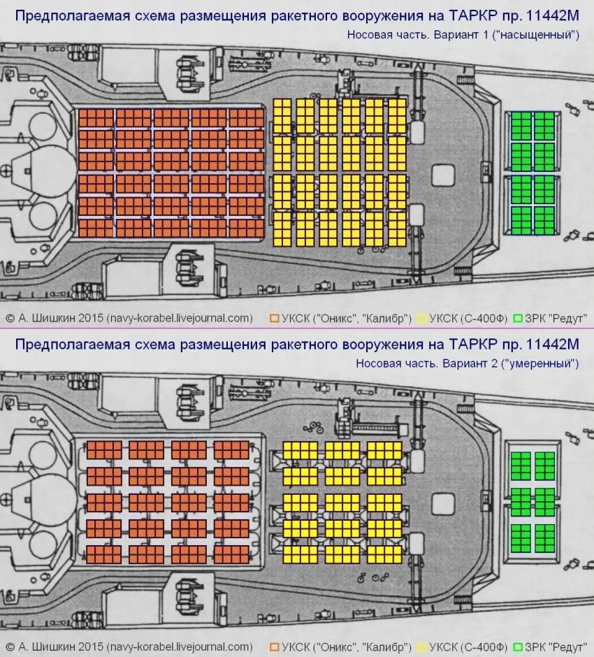 По факту модернизации ТАРК «Адмирал Нахимов» в объёме, который занимали 20 ПУ и 20 ракет «Гранит», теперь размещены 10 ВПУ УКСК 3С14 и 80 ракет различного назначения в транспортно-пусковых стаканах. Вес нового боекомплекта в том же объёме ориентировочно можно оценить в 256 тонн. Вплоть до начала модернизации рассматривались различные предложения и варианты количества пусковых установок ударного вооружения крейсера.
