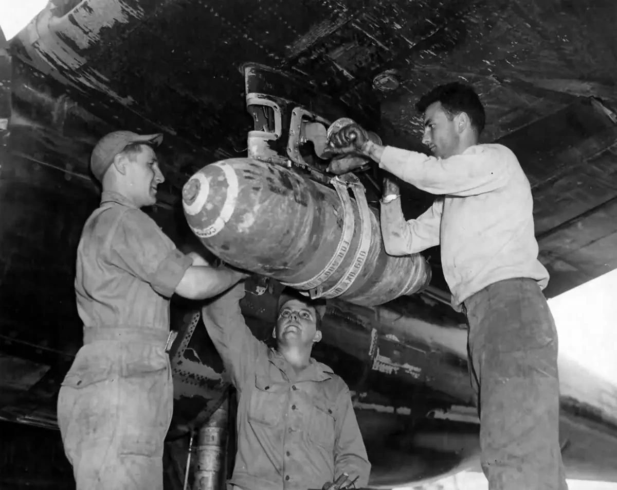 А вот бомбы «вдовы» таскали регулярно. Механики крепят пятисотфунтовку AN-M65A1 на пилоне Р-61