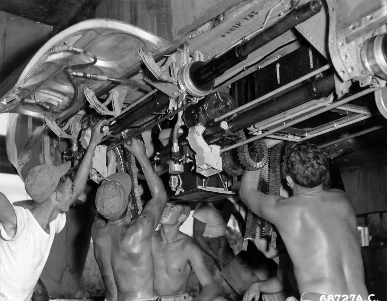 Были у самолёта аргументы и помимо ракетно-бомбового вооружения. Механики обслуживают 20 мм орудия AN/M2