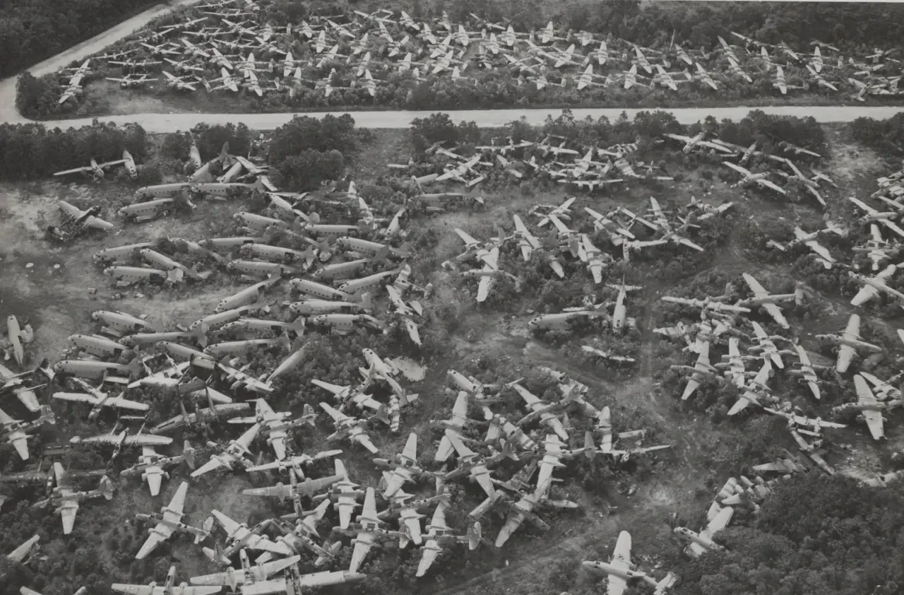 Свалка самолётов перед утилизацией на Новой Гвинеи, 1945 год. Видны Р-38, А-20, В-25, С-47 и Р-61