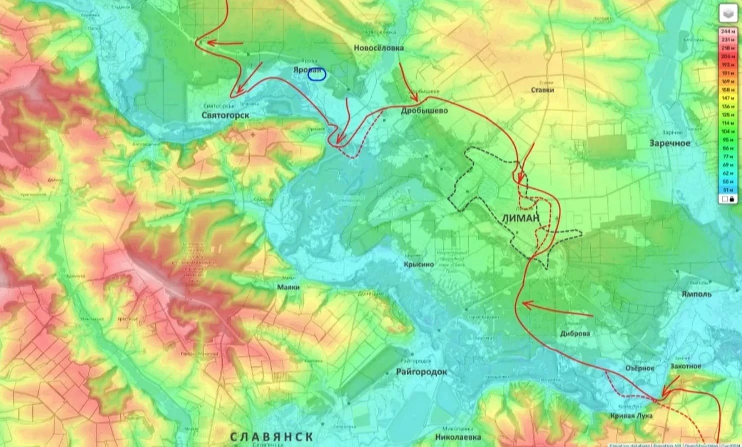 До этого уже была информация, что российские штурмовики пробились к окраинам микрорайона Северный и заняли там позиции в частном секторе. Сейчас бои идут и на востоке от города, а также возле Святогорска, Александровки и Дробышево. В украинском командовании тоже подтверждают, что обстановка под Красным Лиманом для них стала крайне тяжёлой.