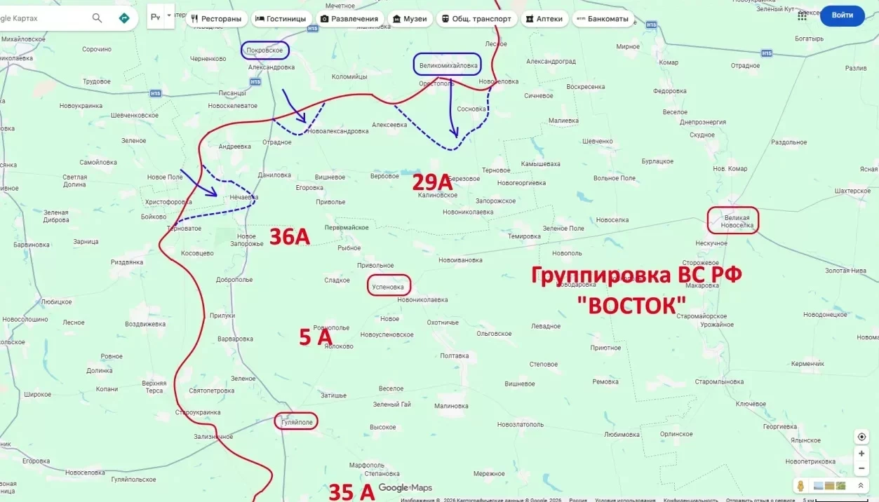 Направление удара: Из района Великой Михайловки на Сосновку и Березовое (основной вектор), а также из Покровского на Новоалександровку.