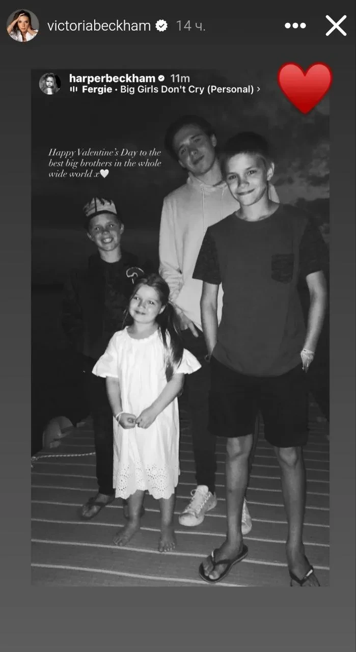 Виктория Бекхэм устроила романтический ужин с мужем Дэвидом Бекхэмом и протянула пальмовую ветвь своему "мятежному" сыну Бруклину, поставив эмодзи в виде сердца на снимок с ним. Меган Маркл поделилась редким фото с мужем, принцем Гарри, и их дочерью Лилибет. "Эти двое + Арчи = мои вечные Валентинки", — подписала снимок герцогиня Сассекская, имея в виду своего сына Арчи.