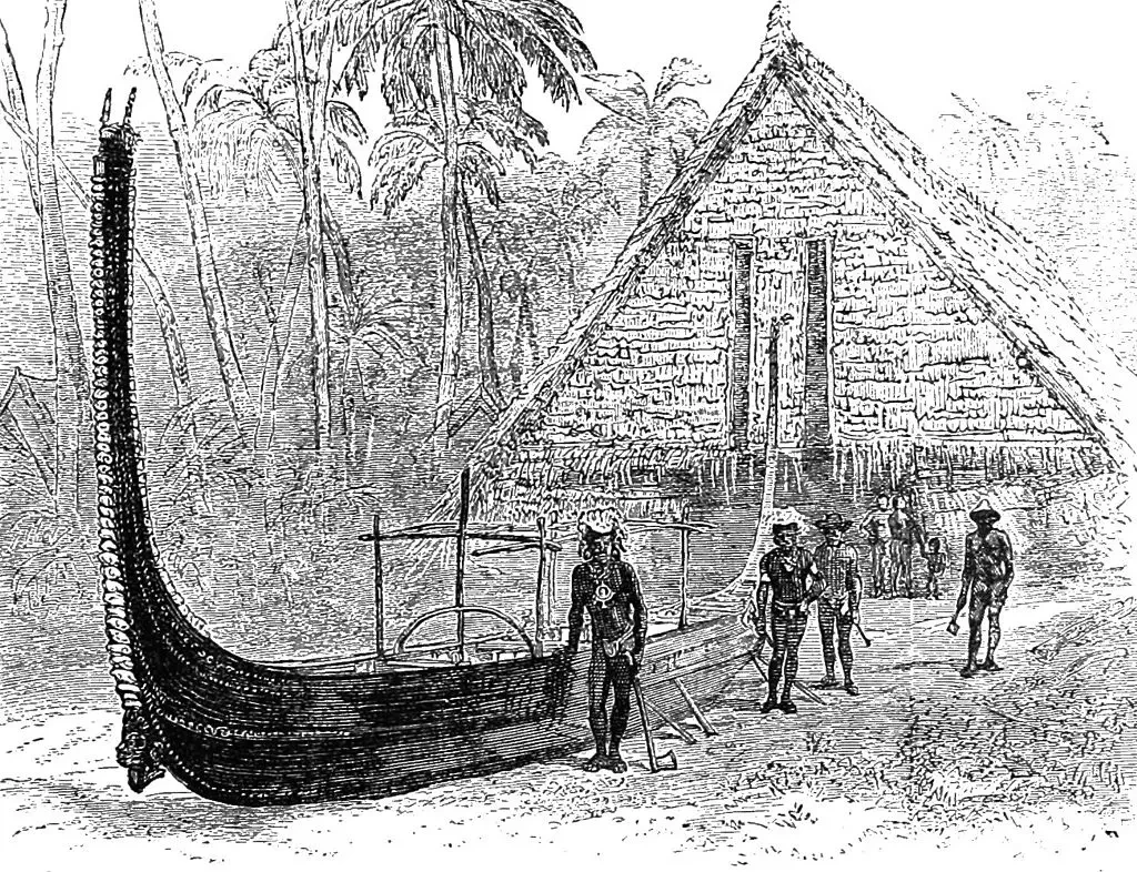 Хотя каноэ Соломоновых островов и впрямь были настолько красивы, что вызывали восхищение всех путешественников, которые их видели, причем их подробно описал британский натуралист Чарльз Моррис Вудфорд. Строили их из досок на каркасе из гнутых шпангоутов, с выступающими вверх носом и кормой, которые украшались перламутром и перьями. Причем в черный цвет окрашивали именно боевые каноэ охотников за головами, ну тех самых людоедов, которым в повести Джека Лондона «Джерри-островитянин» как раз и попался бедняга капитан Ван Хорн.
