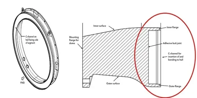 Для склейки использовался двухкомпонентный эпоксидный клей HYSOL® EA 9394, известный также под названием LOCTITE® EA 9394 AERO. Этот клей наносился на торцы корпуса из углеродного волокна и на С-образные канавки в носовом и кормовом титановых кольцах. С-образный профиль имел размеры приблизительно 35 мм в глубину и 127 мм в ширину с небольшим сужением на глубине 122 мм в выемке.