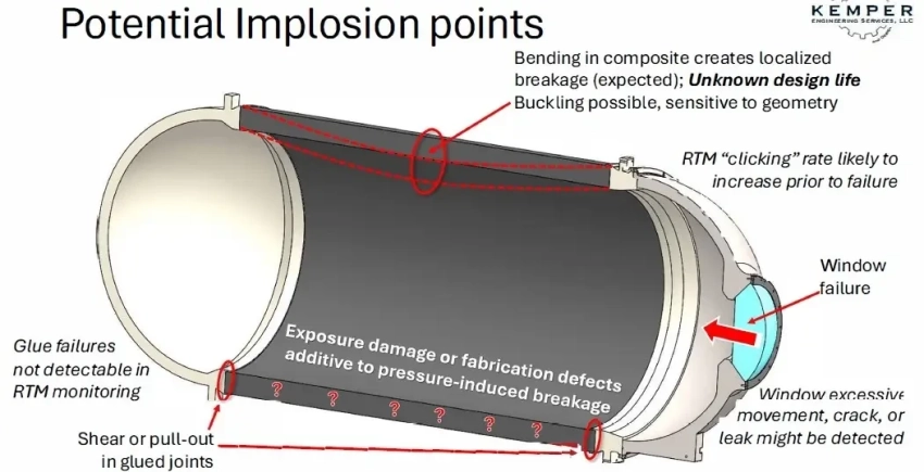 При рабочей глубине погружения 8600 м и коэффициенте запаса прочности 1,5 толщина стенок цилиндрического прочного корпуса, выполненного из углепластикового композита, должна была составлять не менее 81,3 мм. В отчете, в частности, отмечалось, что одним из наиболее критически важных компонентов конструкции является клеевое соединение между композитным корпусом и титановыми сегментами.
