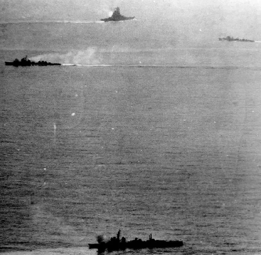 Вид на место проведения операции «Тэн-Го», 7 апреля 1945 года. Эсминец «Касуми» лежит на боку после попадания бомбы, «Хацусимо» и «Фуюцуки» находятся позади него, а за ними виден линкор «Ямато», накренившийся на левый борт и горящий в средней части корпуса.