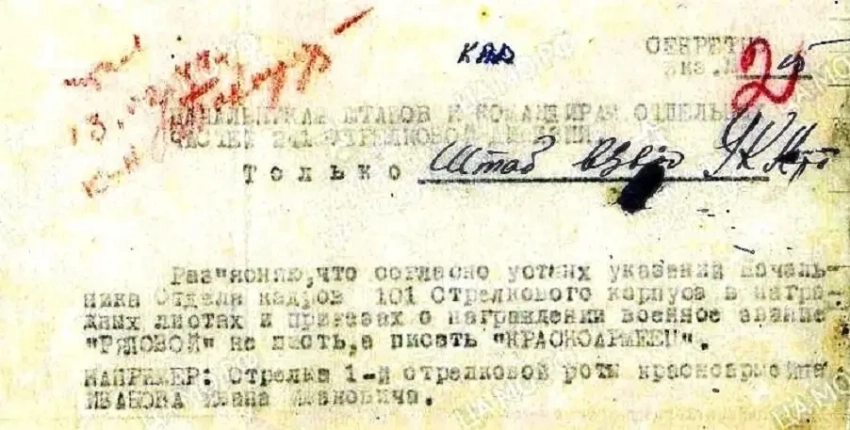 Кадровики пытались навести в этом деле порядок и указывали, что писать следует не «рядовой», а «красноармеец» (документ февраля 1944 г. за подписью начальника 1 отделения штаба 241 сд Лещенко):