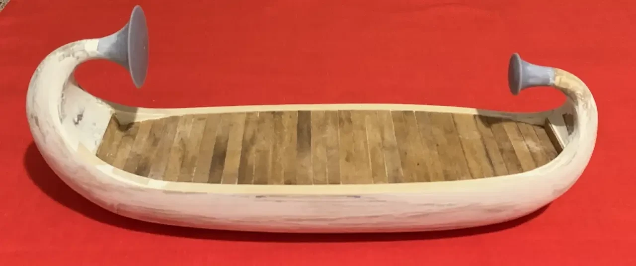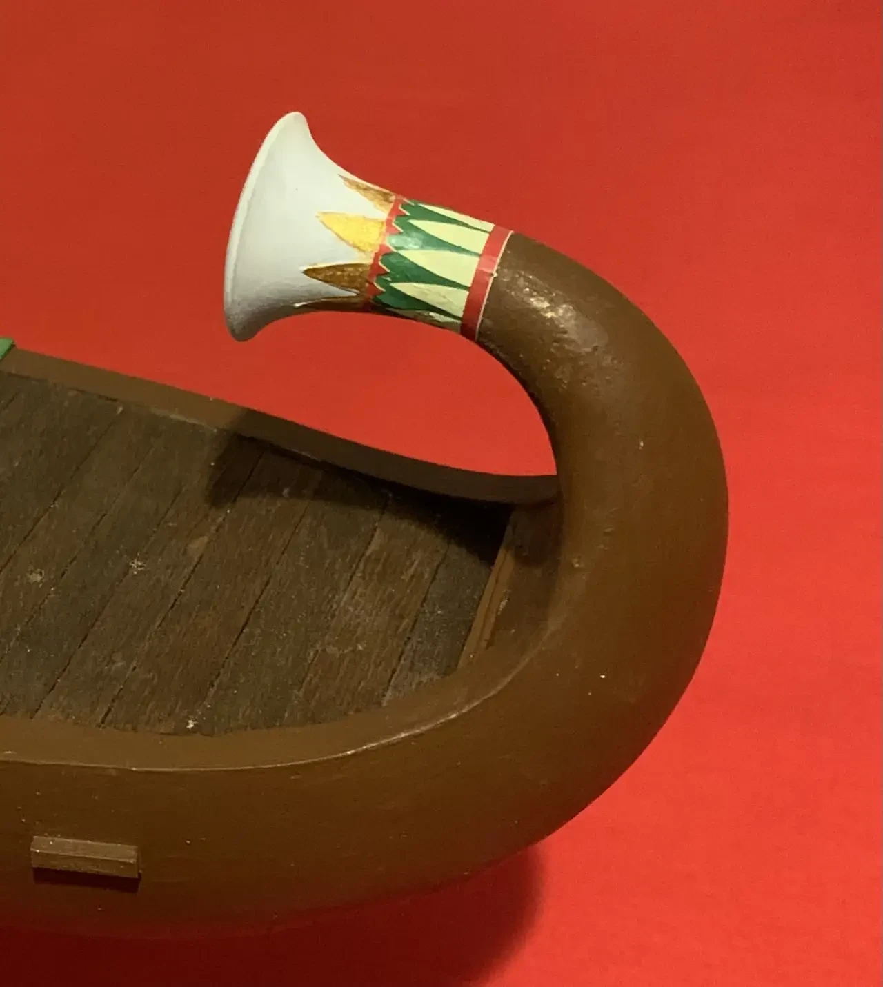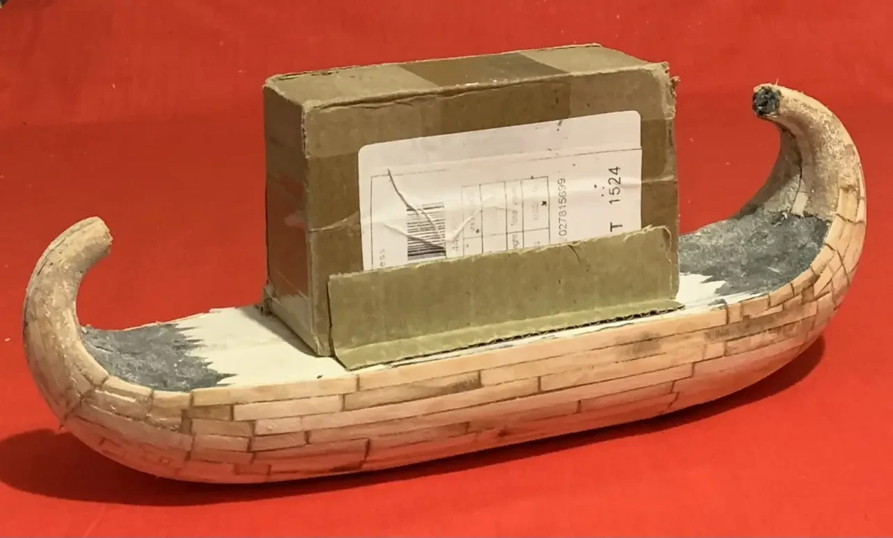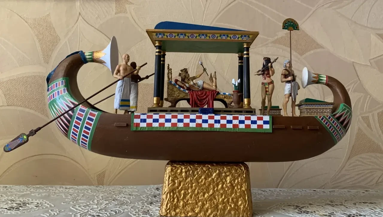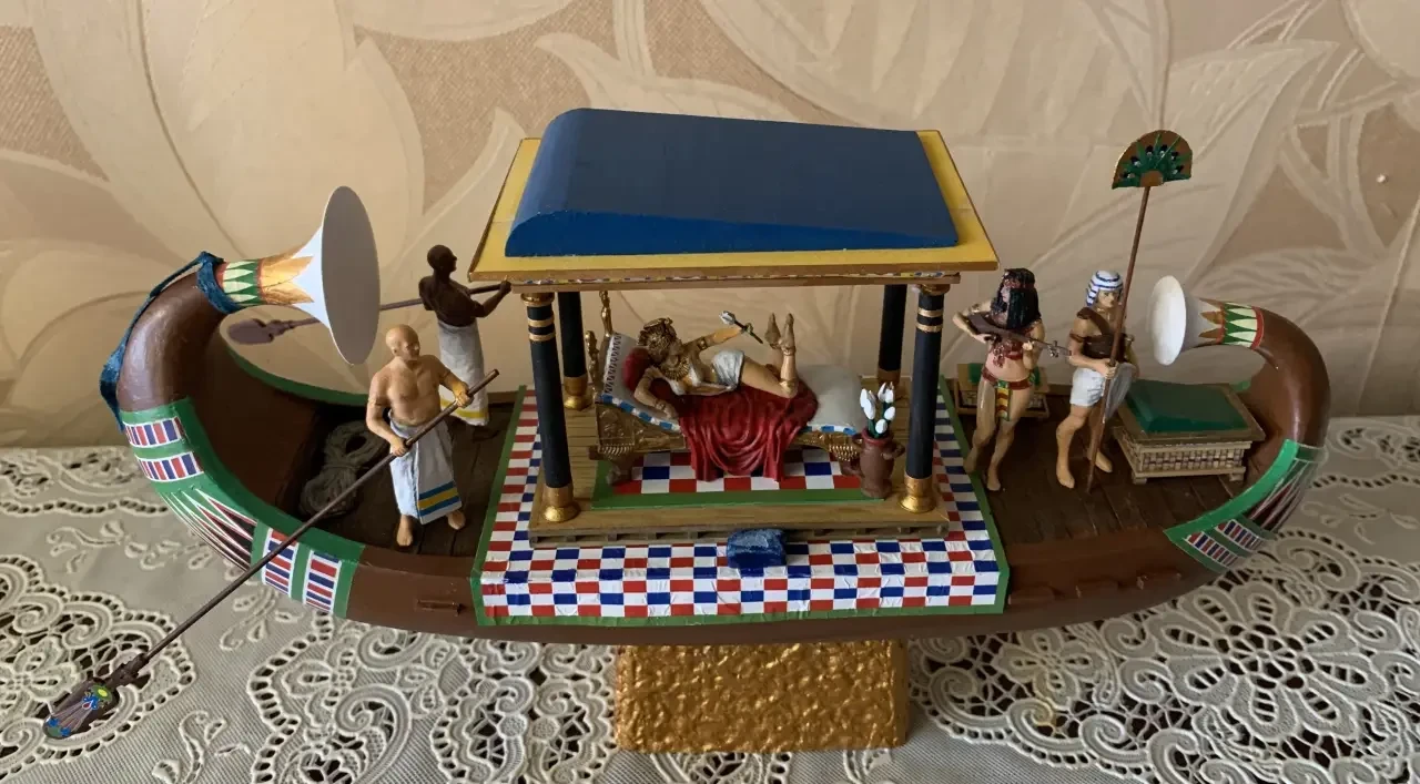 Пожалуй, можно еще одну синюю ленту повязать и на носовой завиток, а на корму поставить штандарт с изображением священного крылатого скарабея и солнечного диска – и тогда на лодке будет уже не Клеопатра, а Нефертити. Но стоит ли всё это делать, еще надо будет подумать. Равно как и решить вопрос: нужна ли сюда еще и подставка из дерева?