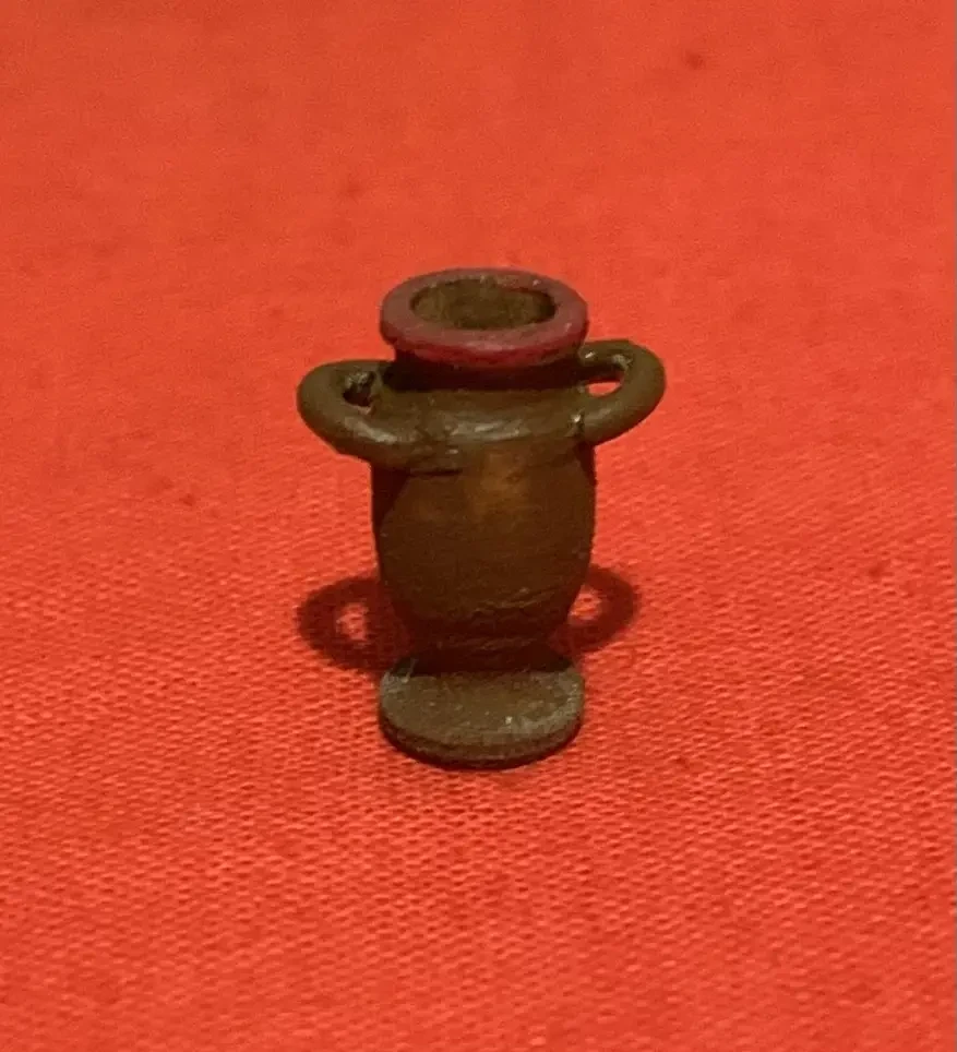 Оказалось, что цветы в корзине на палубе лодки не смотрятся, так же, как и пустой кувшин. Пришлось корзину убрать, а цветы поставить в кувшин рядом с ложем царицы. Кувшин я, кстати, сделал из ручки от засохшей кисточки, используя в качестве токарного станка обычную дрель-шуруповерт, а вот обрабатывался «кувшин» при помощи надфилей. Ручки были сделаны из толстой медной проволоки
