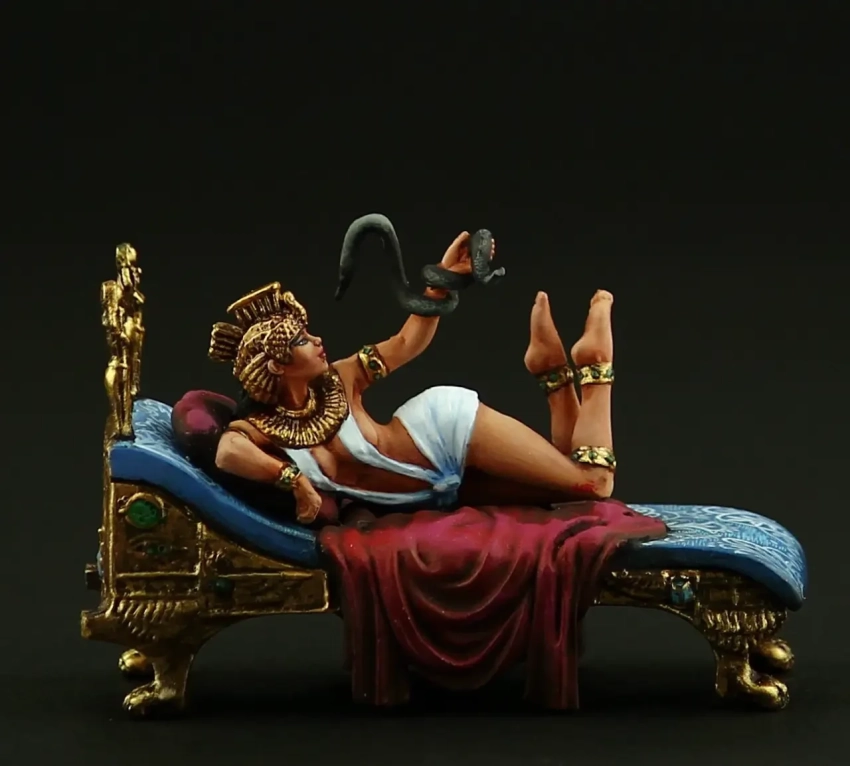 Фигурки эти были выбраны за их максимальное соответствие задуманному, однако их пришлось немного переделать. Так, воин лишался щита и копья, опахалоносцам поменяли наклон рук, рассверлили в них отверстия под весла. А еще, это уже я сам делал, пришлось поменять на них набедренные повязки на длинные «юбки» из… туалетной бумаги и японской модельной шпаклевки. У царицы Клеопатры я попросил удалить с руки змею, а также у всех фигурок подставки из-под ног убрать, заменив металлическими штырьками. Раскрашивал фигурки, понятно, я уже сам…