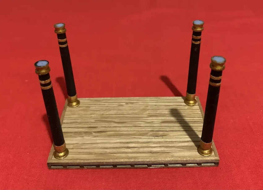 Затем в корпус была вклеена палуба и зашита «досками» от старой вьетнамской циновки. Весь корпус тщательно покрыт японской модельной шпаклевкой, а на оконечности приклеены «распустившиеся головки цветов лотоса»