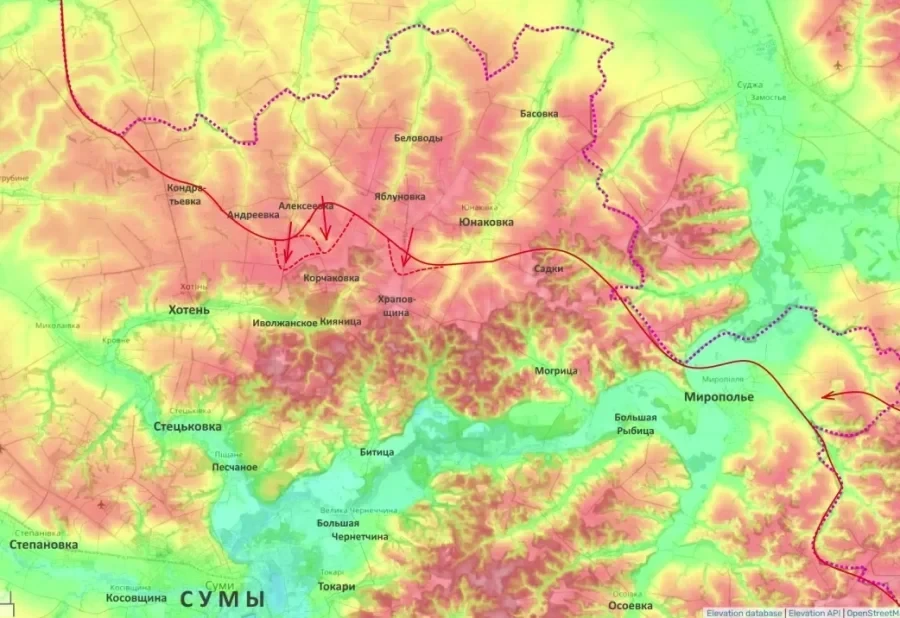 Отдельно отмечается активизация в Глуховском районе Сумской области, в том числе в районе Сопича. Российские подразделения, опираясь на ранее занятые Харьковку, Комаровку и Сидоровку, пытаются сократить выступ у границ Курской и Брянской областей. Среди обозначенных целей - выход на линию Бычково - Суходол - Уланово.