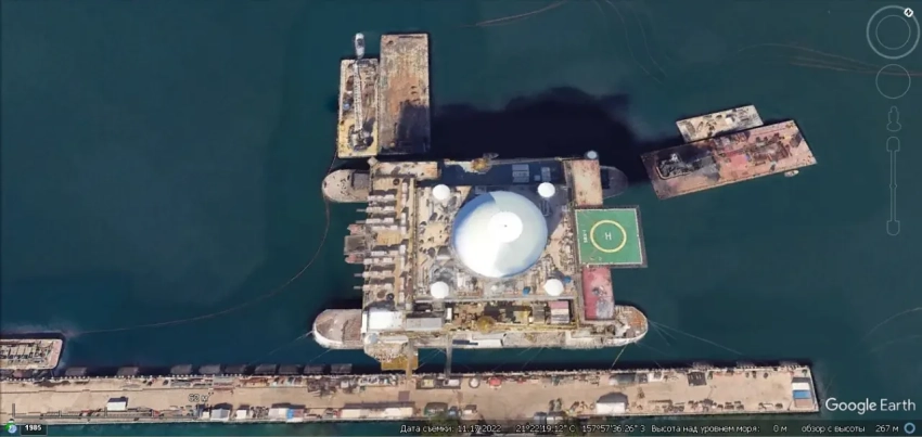 Спутниковый снимок Gооglе Еаrth: РЛС SBX-1 у пирса военно-морской базы Пёрл-Харбор. Снимок сделан в ноябре 2022 года