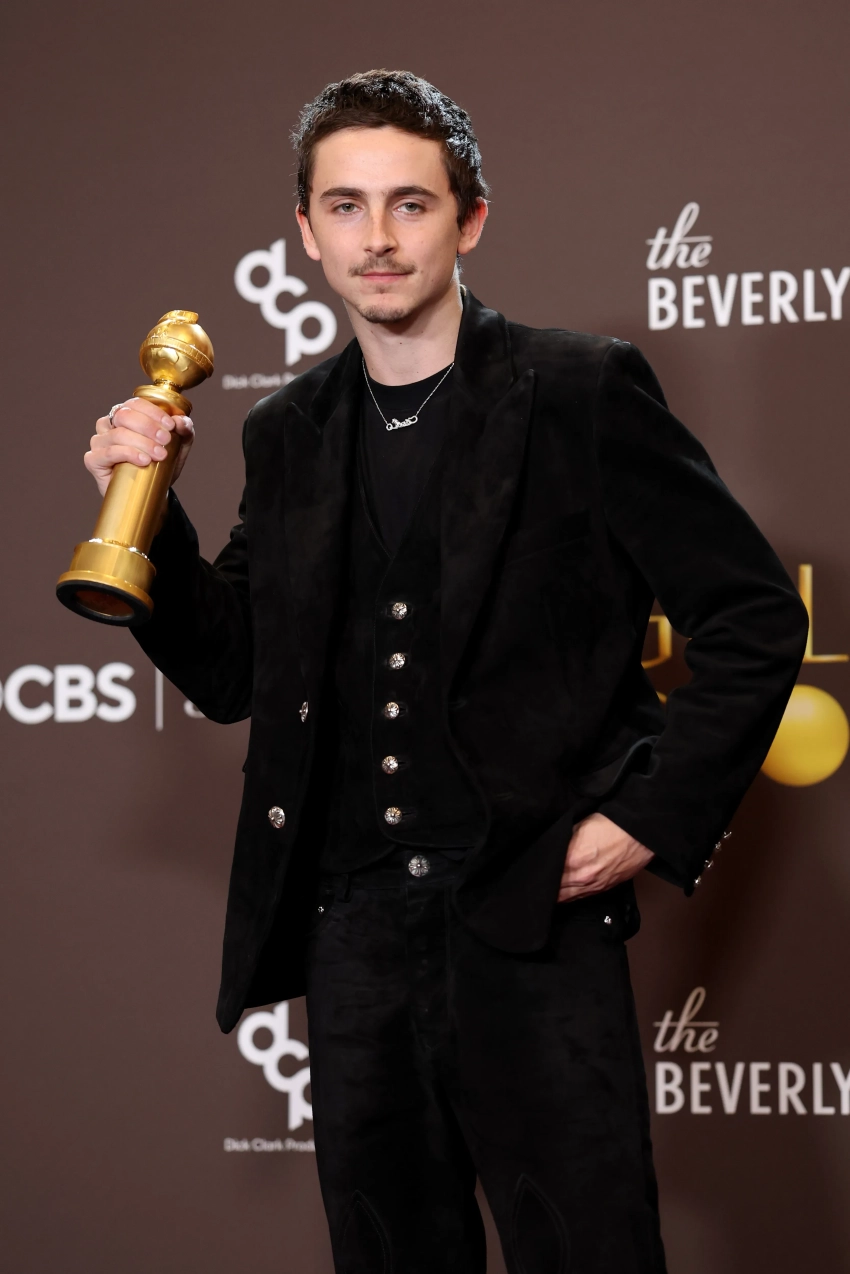 Тимоти Шаламе на "Золотом глобусе" вновь обратился со сцены к своей возлюбленной Кайли Дженнер, которая, хоть и не сопровождала актёра на красной дорожке, но присутствовала в зале (в "золотом" платье Ashi Studio и украшениях Lorraine Schwarz с бриллиантами общим весом более 100 каратов)."Моим родителям и моей партнёрше — я вас люблю. Большое вам спасибо", — сказал Тимоти, забирая статуэтку в номинации "Лучший актёр мюзикла или комедии". По возвращении в зал он поцеловал возлюбленную.