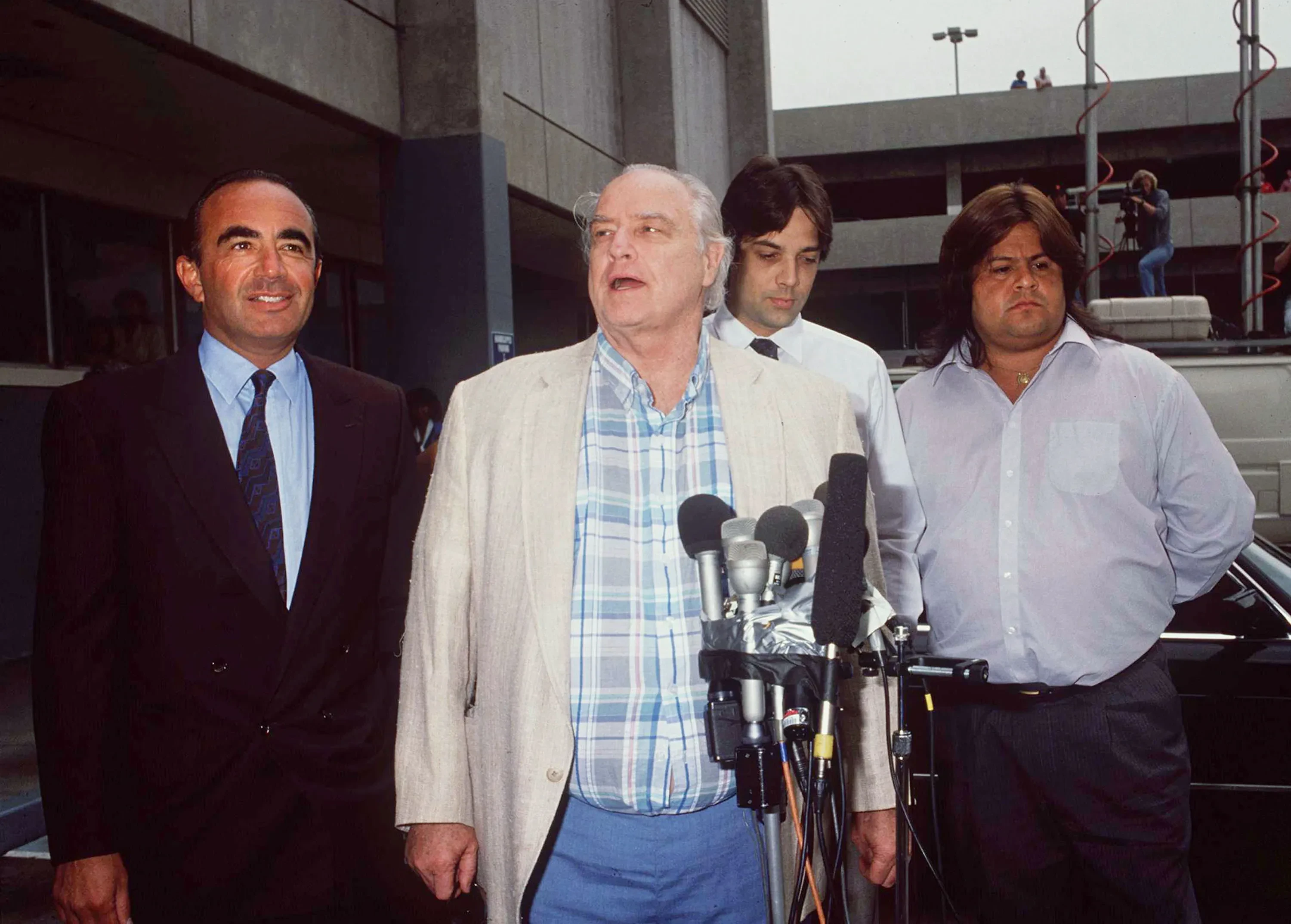 Марлон Брандо (в центре) и его сын Кристиан (позади)При этом ранее в сети уже обращали внимание на тот факт, что Биги, как сейчас зовут Джексона-младшего, поразительно похож на детей Брандо с их глубоко посаженными тёмными глазами и густыми бровями, а также на то, что младший из Джексонов мало похож на своих старших брата и сестру.