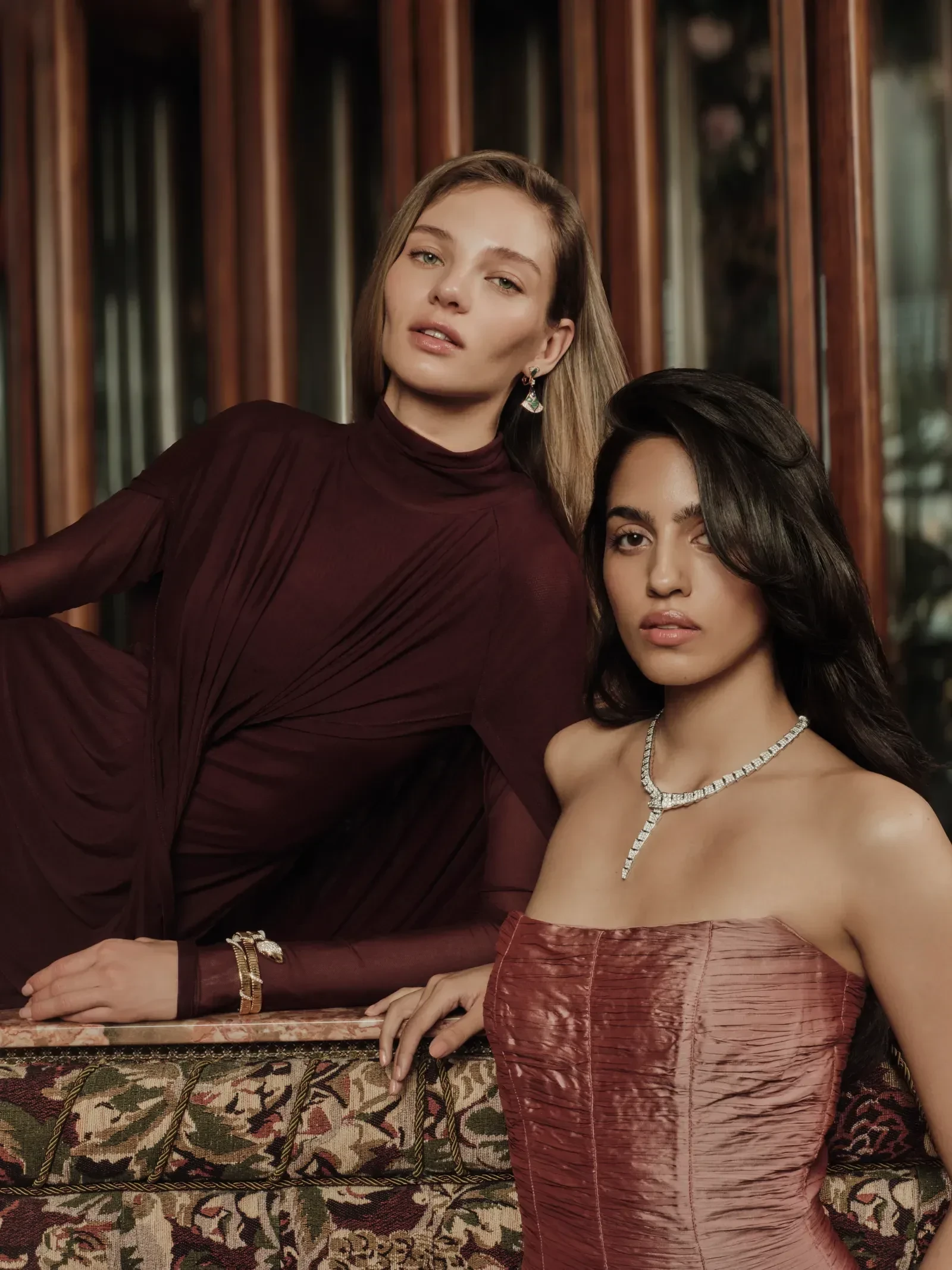 27-летняя Алеся Кафельникова снялась в фотосессии для арабской версии модного журнала Vogue. На снимках российская модель позирует в вечерних платьях и украшениях Bvlgari одна и вместе с коллегами.
