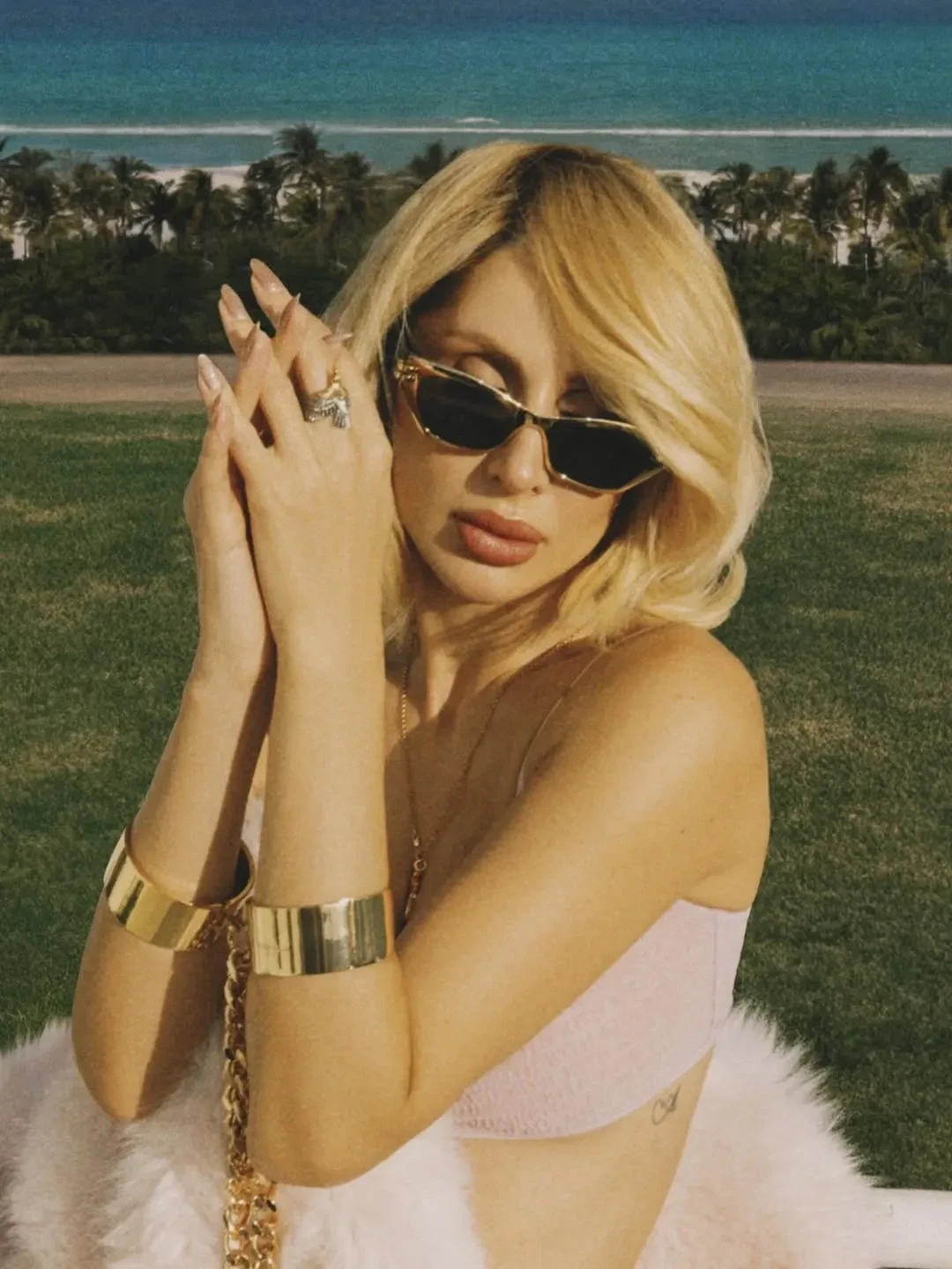 Светлана Лобода снялась в новой фотосессии в Дубае. На снимках, которые 43-летняя певица опубликовала в соцсетях, она позирует в нижнем белье, чулках и шубе на фоне пляжа. Образ дополнили золотые наручники и солнцезащитные очки.