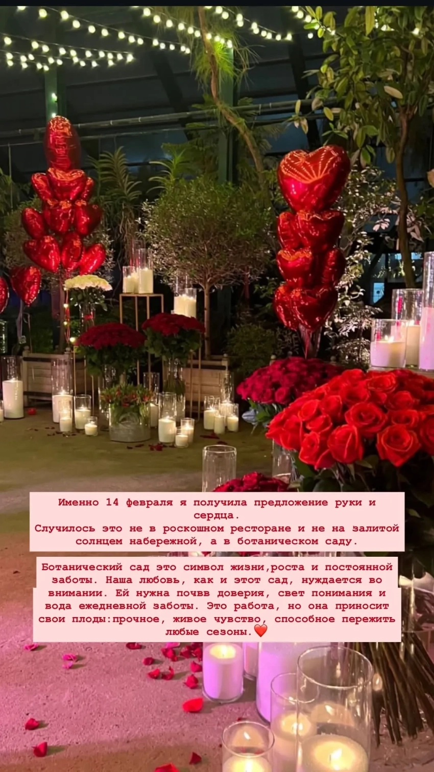 "Когда у тебя рядом такой сильный мужчина, то естественное стремление — расти вместе, чтобы наше партнёрство было союзом двух полноценных миров, а не историей про придаток к успеху. Так что быть женой такого человека — значит быть соавтором его мира. А для этого нужен собственный, сильный и яркий характер. Это и есть настоящая роскошь — вместе создавать что-то большее, чем просто быт или статус", — сказала жена миллионера и показала, с каким размахом Новиков делал ей предложение руки и сердца 14 февраля в Ботаническом саду.