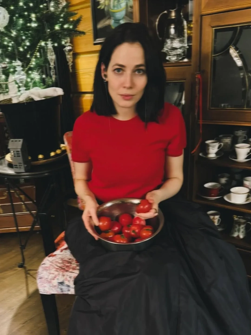 На снимках актриса позирует в красной футболке и чёрной юбке бренда Present & Simple и туфлях Age of Innocence. "Новый год как предчувствие. Вера, надежда и любовь", — подписала фотографии Снигирь.