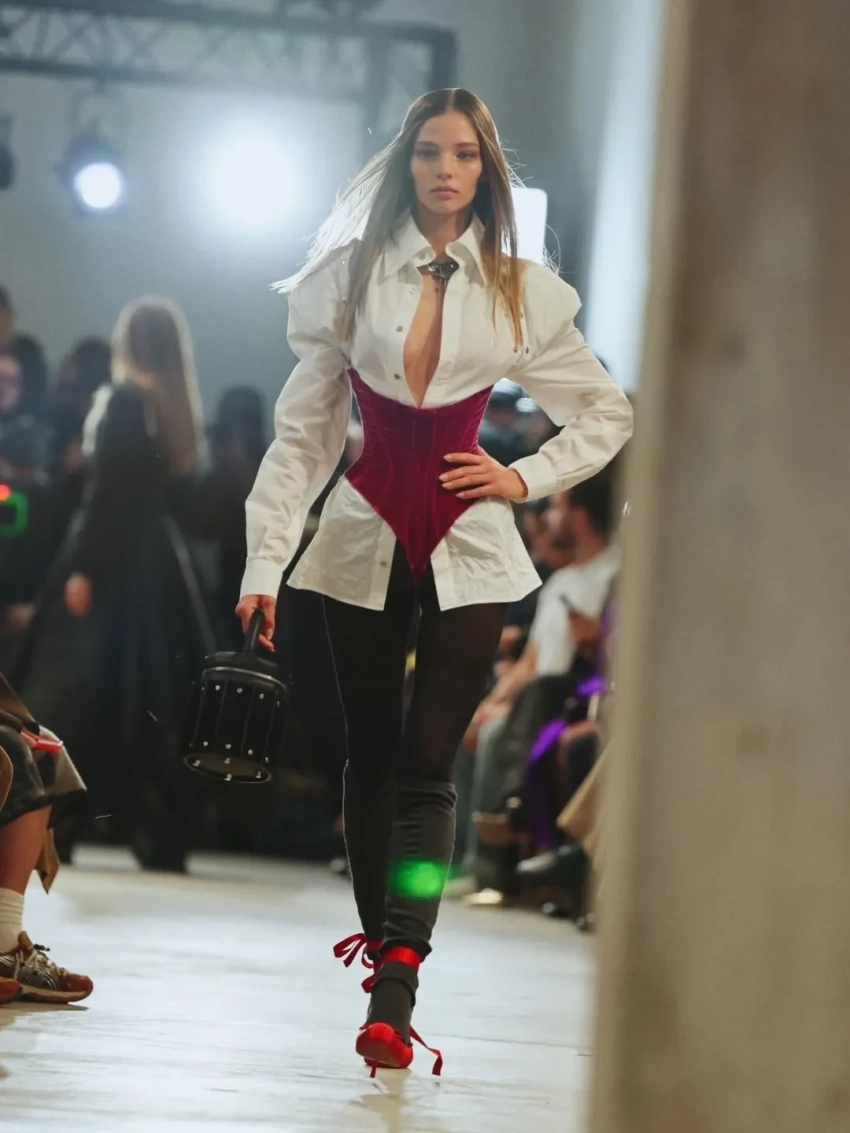 Кафельникова вышла на подиум в белой рубашке с декольте, колготках и розовом корсете. Также она примерила корсет из прозрачной ткани с юбкой, красные джинсы с бомбером и показала закулисье шоу.