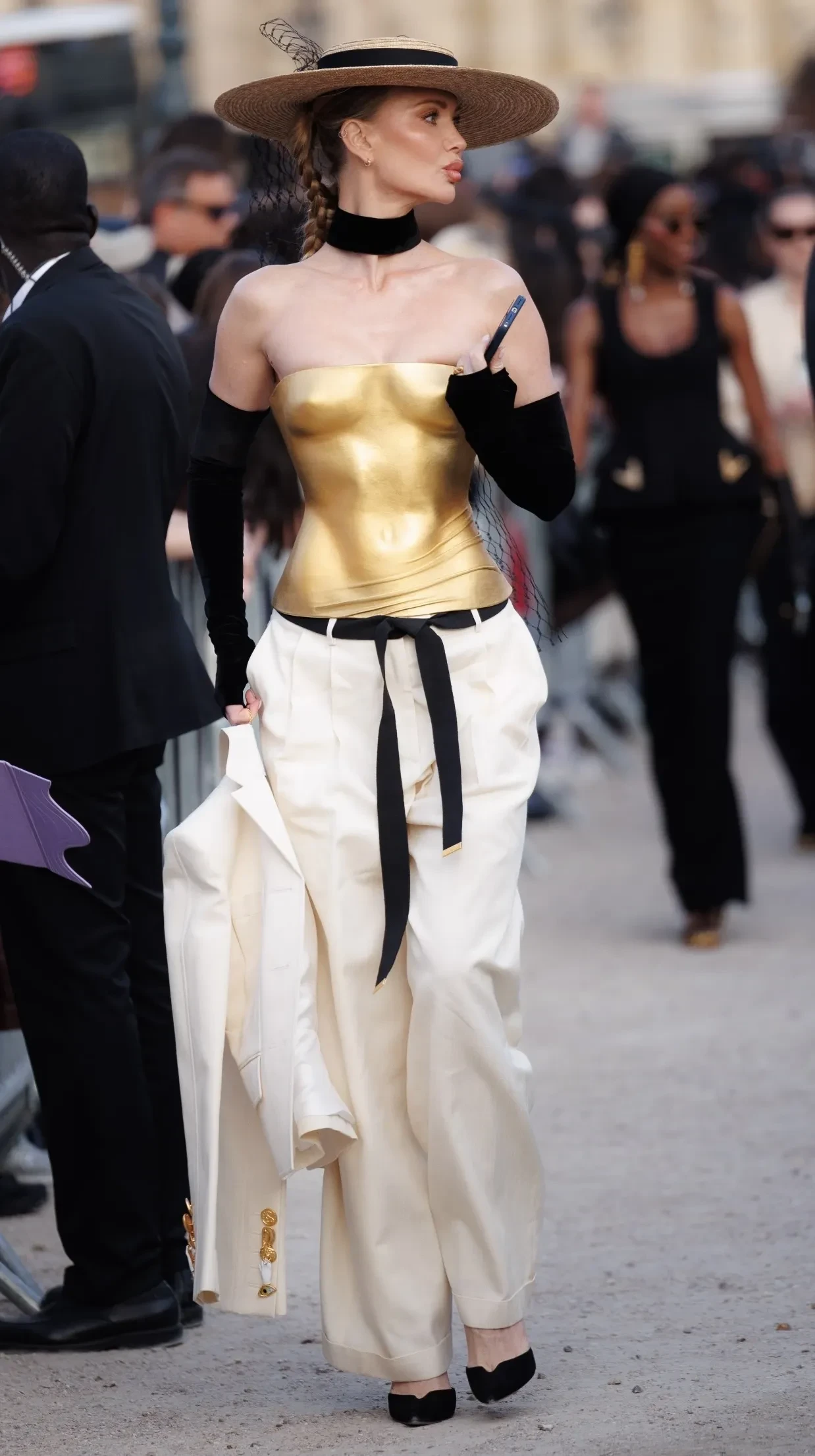 Татьяна Корсакова оказалась в центре внимания фотографов благодаря своему очередному яркому образу, который она подобрала для шоу. Модель надела золотой корсет, повторяющий изгибы тела, широкие белые брюки и шляпу. 31-летняя Кристина Романова и супруга ресторатора Станислава Лисиченко Дарья пришли в одинаковых жакетах, а жена бывшего гендиректора "Белой дачи" Владимира ЦыгановаОксана Бондаренко позировала в белом пальто с золотыми деталями.