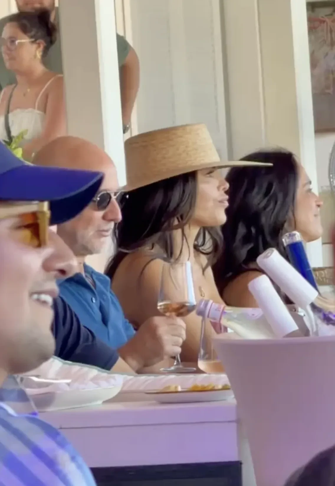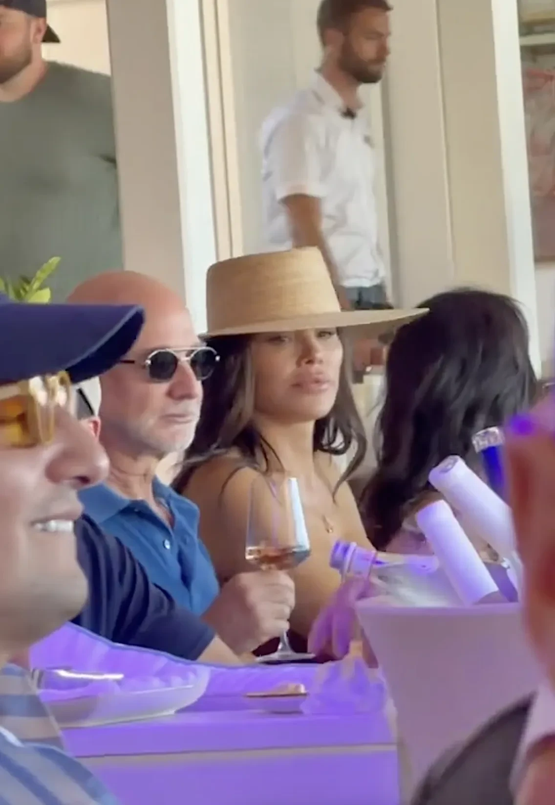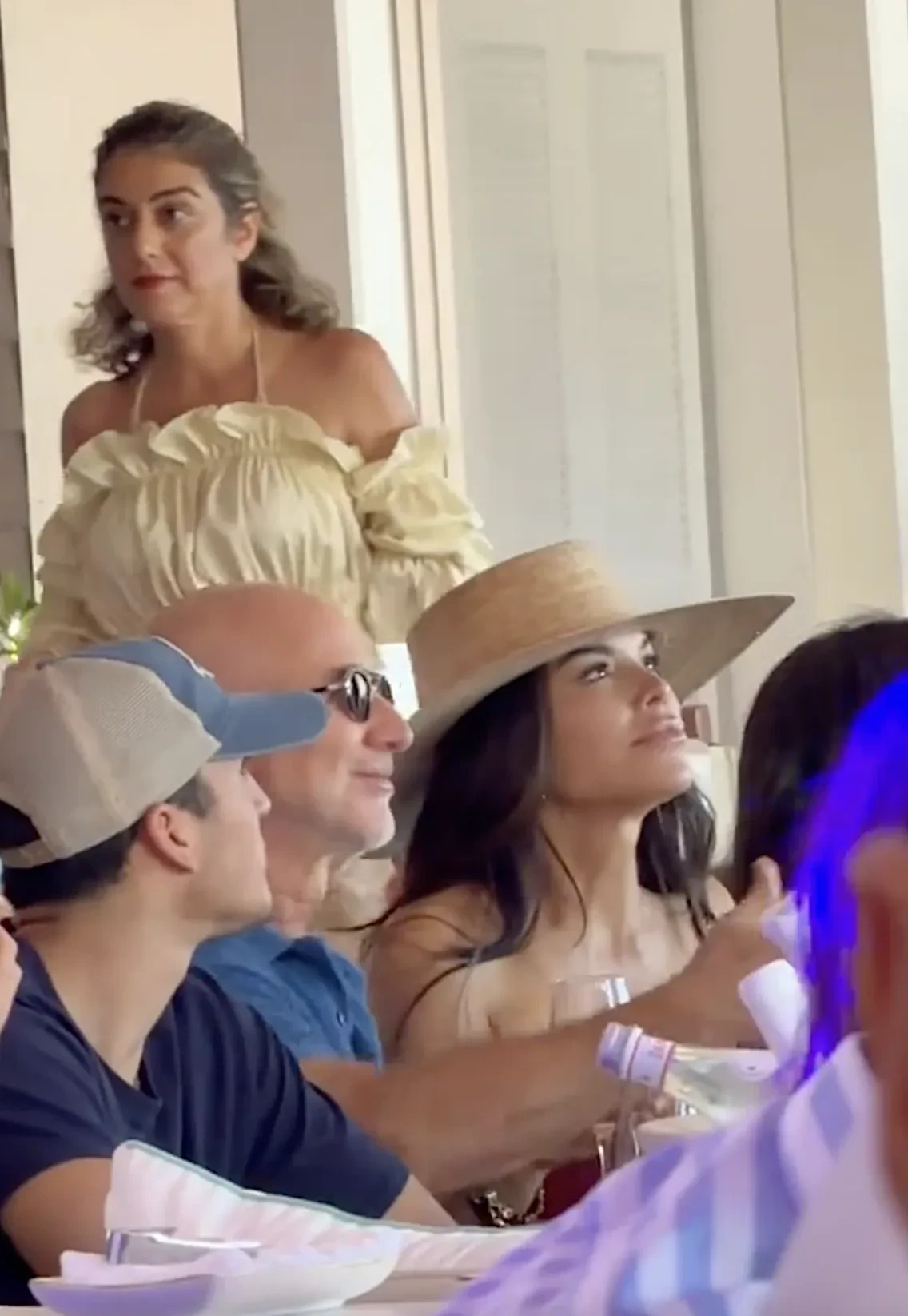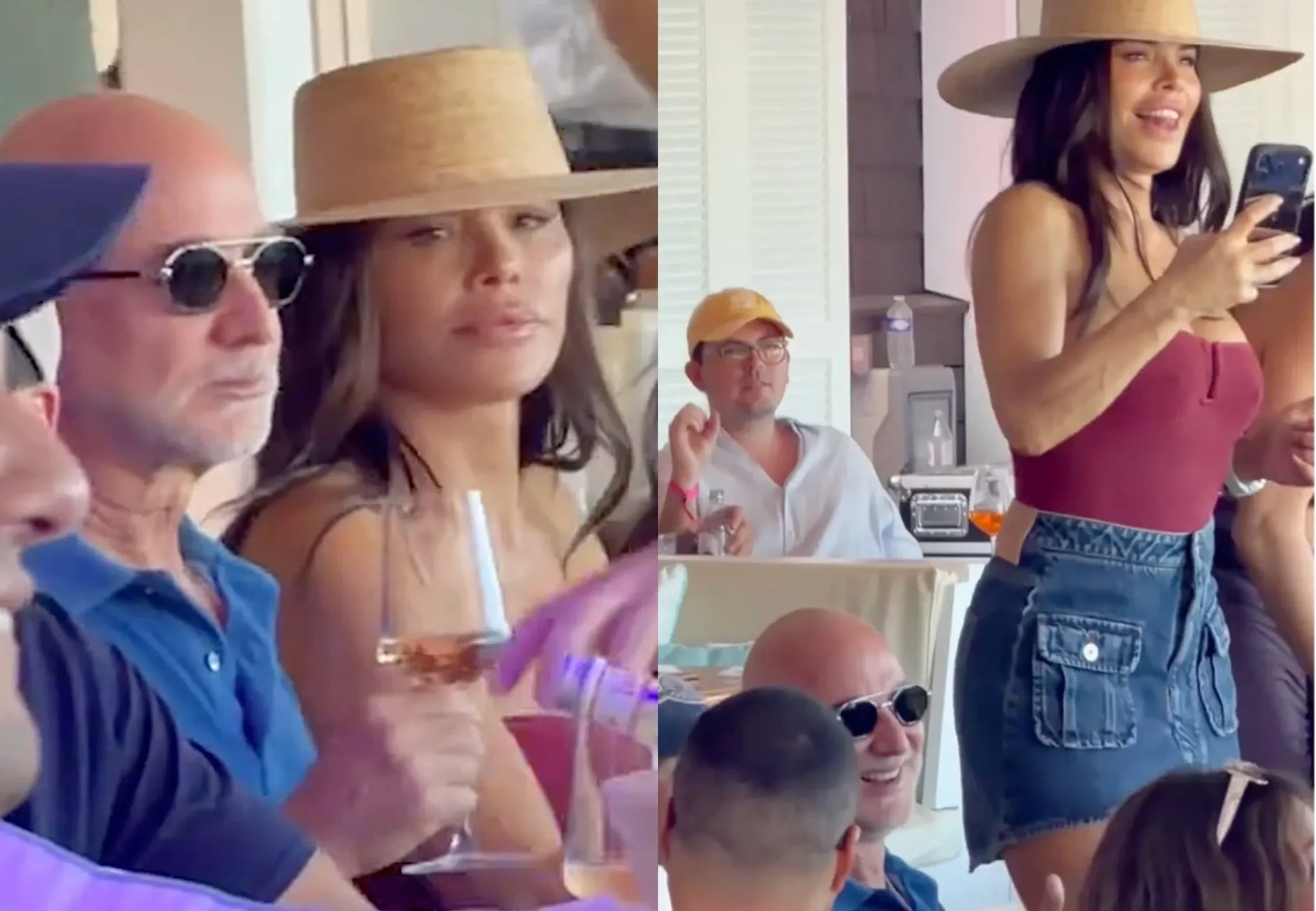 Безос и Санчес сидели за общим столом, общались с друзьями и пили вино, а спустя время супруга миллиардера решила станцевать на стуле. Она была одета в джинсовую мини-юбку, топ без бретелей и шляпу.