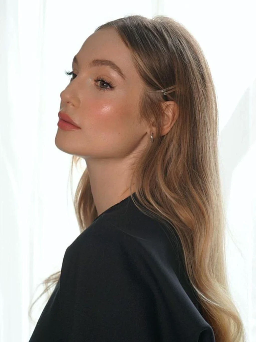 Полуоткрытая укладка — идеальный баланс между мягкостью и структурой. Скулы здесь подчеркиваются сразу двумя факторами: открытым лицом и волнами, уходящими назад. Текстура создает световые переходы, которые усиливают рельеф, особенно при вечернем освещении.