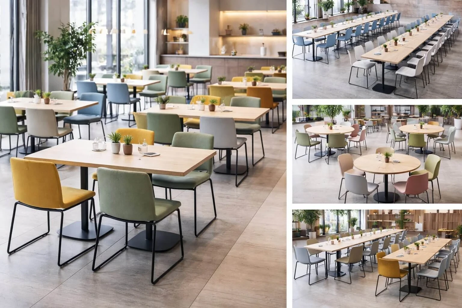 Прямоугольные столы размером 160×80 см размещают 6 стульев: по 2 с торцов и по 1 с каждой длинной стороны. Стулья у длинных сторон располагают на расстоянии 80 см друг от друга. При увеличении длины стола на каждые 60 см добавляется одно посадочное место.