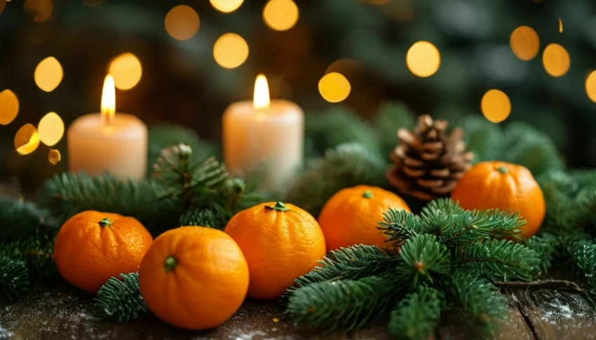 - Декор: хвойные композиции, шишки, свечи, мандарины.