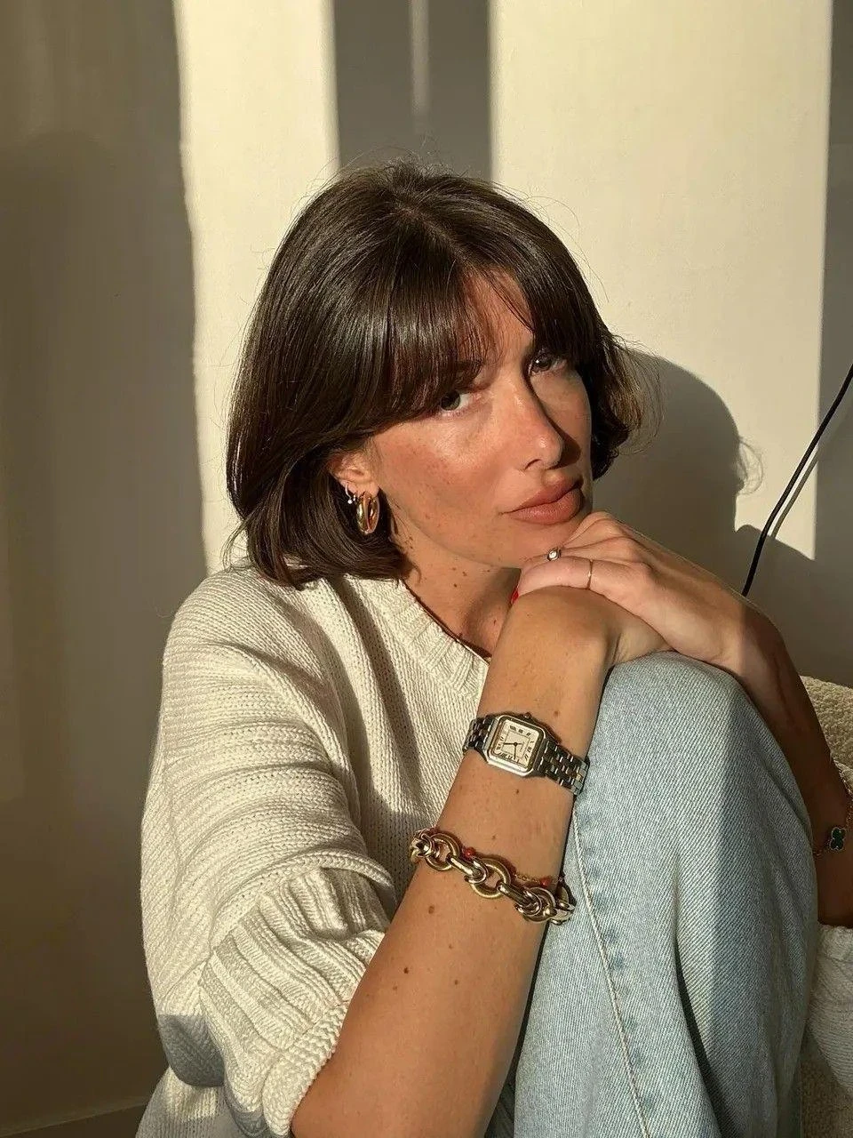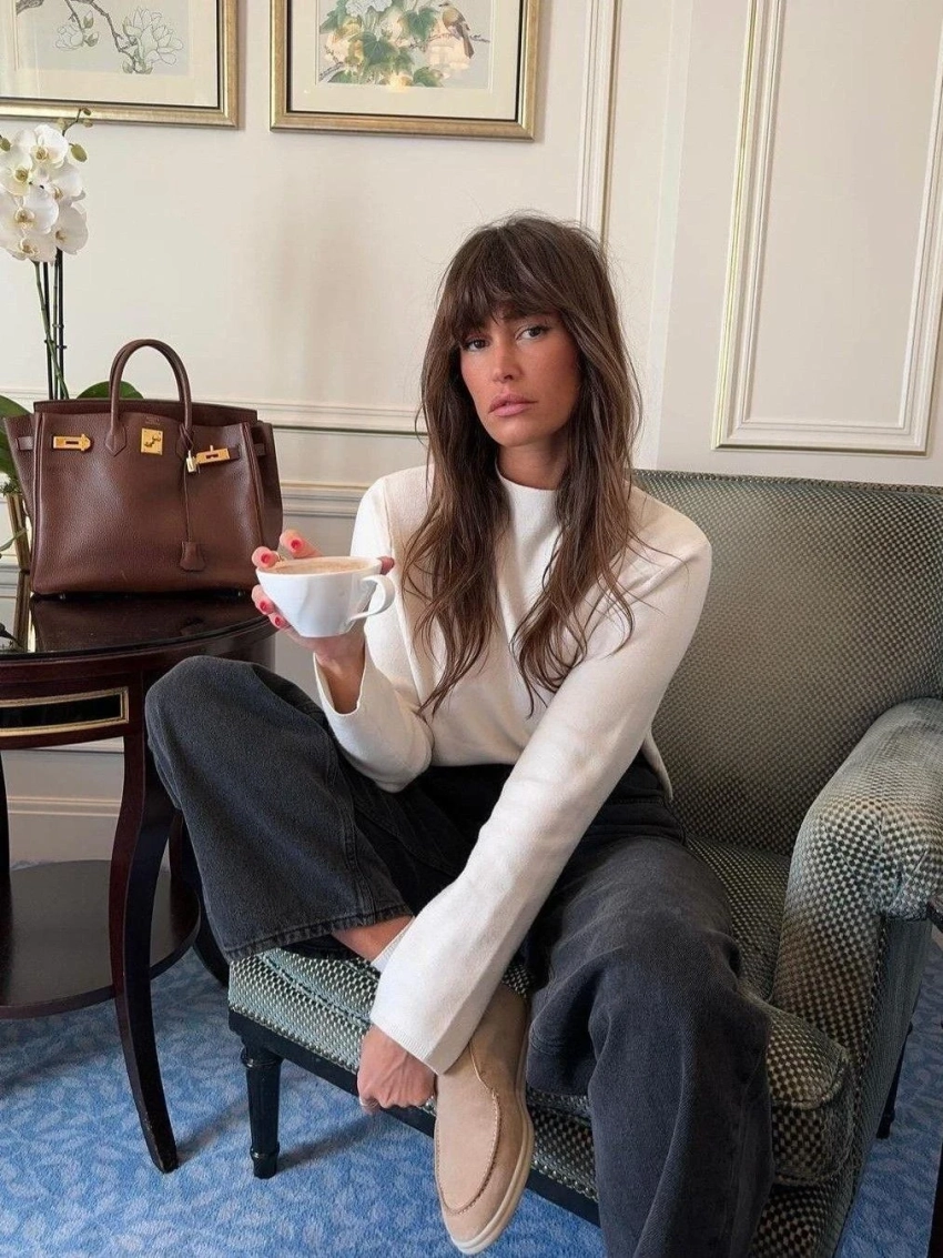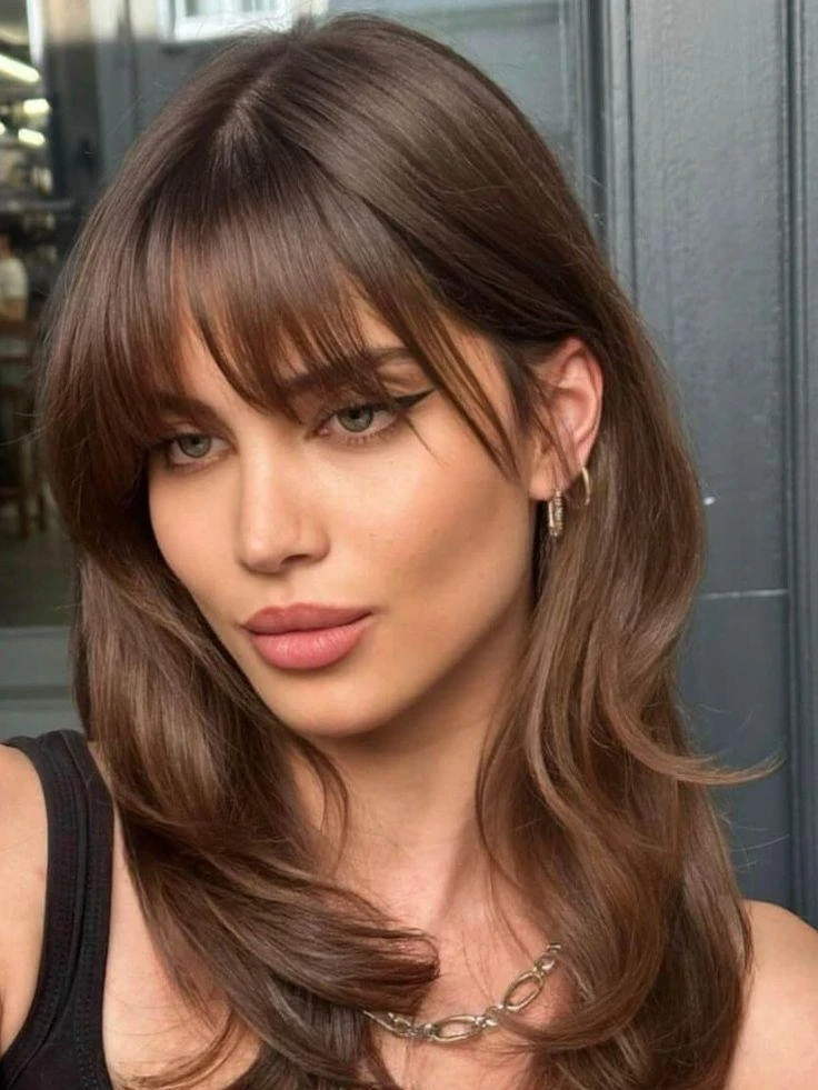 Мягкая дугообразная челка повторяет линии лица, делает образ гармоничным и спокойным. Это один из самых нейтральных и универсальных вариантов сезона.